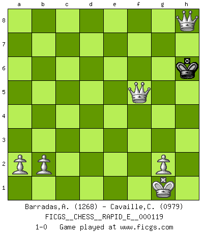 Last move : 1-0 2013 November 30 22:49:50 [Event "FICGS__CHESS__RAPID_E__000119"] [Site "FICGS"] [Date "2013.11.23"] [Round "1"] [White "Barradas,Anderson"] [Black "Cavaille,Cedric"] [Result "1-0"] [WhiteElo "1268"] [BlackElo "0979"] 1.e4 e5 2.Nf3 Nc6 3.d4 Nxd4 4.Nxd4 exd4 5.Qxd4 Qe7 6.Nc3 d6 7.Bd3 Nf6 8.Bg5 Qe6 9.O-O Be7 10.Rfe1 O-O 11.e5 Nd7 12.Bxe7 Qxe7 13.exd6 Qxd6 14.Qe4 Nf6 15.Qh4 a6 16.Ne4 h6 17.Nxd6 cxd6 18.Re3 b5 19.Rf3 Re8 20.Rg3 h5 21.Re3 Rxe3 22.fxe3 Bb7 23.Rf1 Re8 24.Re1 Be4 25.Bxe4 Rxe4 26.Qg3 Ng4 27.h3 Rxe3 28.Rxe3 Nxe3 29.Qxe3 g6 30.Qb6 Kg7 31.Qxd6 f6 32.Qxa6 g5 33.Qxb5 Kg6 34.Qd3+ Kh6 35.Qf5 g4 36.hxg4 hxg4 37.Qxg4 f5 38.Qxf5 Kg7 39.c4 Kh6 40.c5 Kg7 41.c6 Kg8 42.c7 Kg7 43.c8Q Kh6 44.Qh8+ 1-0 Scotch : Lolli variation Kingside Castling by player White (move 9) Kingside Castling by player Black (move 10) 10 pieces endgame at move 36 : White KQPPPPP , Black KPP WHITE : King + 1 Queen 5 Pawns BLACK : King + 2 Pawns 9 pieces endgame at move 36 : White KQPPPP , Black KPP WHITE : King + 1 Queen 4 Pawns BLACK : King + 2 Pawns 8 pieces endgame at move 37 : White KQPPPP , Black KP WHITE : King + 1 Queen 4 Pawns BLACK : King + 1 Pawn 7 pieces endgame at move 38 : White KQPPPP , Black K WHITE : King + 1 Queen 4 Pawns BLACK : King + Promotion Queen by player White (move 43) Player White won this chess game. Follow this game move after move (download)You may learn much more from a game you lose than from a game you win. You will have to lose hundreds of games before becoming a good player. (Jose Raul Capablanca) In der Schule lernt man nichts. Es ist nur Zeitverschwendung. (Robert James Fischer) Los libros de Ajedrez deben de usarse igual como usamos los anteojos: para mejorar la vista, aunque algunos jugadores los quieren usar como si ellos les otorgaran la vision. (José Raúl Capablanca) On n'a jamais que l'âge auquel on a commence à jouer aux échecs car après on cesse de vieillir. (Capablanca) The Internet isn't free. It just has an economy that makes no sense to capitalism. (Brad Shapcott)