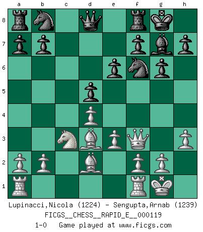 Last move : 1-0 2014 January 10 22:47:7 [Event "FICGS__CHESS__RAPID_E__000119"] [Site "FICGS"] [Date "2013.11.23"] [Round "1"] [White "Lupinacci,Nicola"] [Black "Sengupta,Arnab"] [Result "1-0"] [WhiteElo "1224"] [BlackElo "1239"] 1.d4 Nf6 2.c4 g6 3.Nc3 Bg7 4.Nf3 d5 5.e3 O-O 6.Bd3 c6 7.O-O Bg4 8.h3 Bxf3 9.Qxf3 e6 10.cxd5 cxd5 11.Bd2 1-0 This chess game has been lost on time (started : 2013.11.23 17:44:58) King's Indian defense, 3.Nc3 Kingside Castling by player Black (move 5) Kingside Castling by player White (move 7) Player White won this chess game. Follow this game move after move (download)If your opponent offers you a draw, try to work out why he thinks he's worse off. (Nigel Short) Wie, soll nun auch die Opposition abgeschafft werden? Ja, es tut mir leid, Ihnen diesen Schmerz nicht ersparen zu können. (Aaron Nimzowitsch) El Ajedrez no es una pizca de inferior al violín, y tenemos un gran número de violinistas profesionales. (Mikhail Botvinnik) La menace est plus forte que l'exécution. (Aaron Nimzovitch) The mind is like a parachute, it only functions when its open. (Unknown)