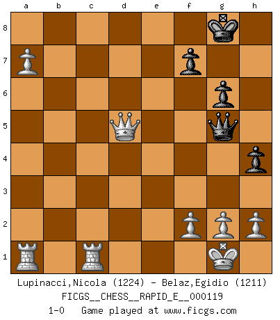 Last move : 1-0 2014 January 28 17:57:51 [Event "FICGS__CHESS__RAPID_E__000119"] [Site "FICGS"] [Date "2013.11.23"] [Round "1"] [White "Lupinacci,Nicola"] [Black "Belaz,Egidio"] [Result "1-0"] [WhiteElo "1224"] [BlackElo "1211"] 1.d4 Nf6 2.c4 e6 3.Nc3 Bb4 4.a3 Bxc3+ 5.bxc3 O-O 6.Nf3 Ne4 7.Qc2 Nf6 8.Bg5 d6 9.e3 Nbd7 10.Bd3 g6 11.O-O b6 12.Rfd1 Qe8 13.Bh6 Bb7 14.Bxf8 Qxf8 15.a4 a5 16.e4 c5 17.d5 exd5 18.cxd5 Bc8 19.Bb5 Qh6 20.Bxd7 Bxd7 21.e5 dxe5 22.Nxe5 Bf5 23.Qd2 Qf8 24.d6 Nd7 25.Nxd7 Bxd7 26.Re1 Rd8 27.Re7 Qg7 28.Rae1 Be6 29.Rb7 c4 30.Rxb6 Bd7 31.Ra1 Qe5 32.Qe3 Qf6 33.Qe7 Qxc3 34.Qxd8+ Kg7 35.R6b1 Bf5 36.Rc1 Qd4 37.Qxa5 Qxd6 38.Qc3+ Kg8 39.Qxc4 Be6 40.Qc6 Qf4 41.a5 Qg5 42.Qf3 h5 43.a6 h4 44.a7 Bd5 45.Qxd5 1-0 Nimzo-Indian : Saemisch variation Kingside Castling by player Black (move 5) Kingside Castling by player White (move 11) Player White won this chess game. Follow this game move after move (download)Look at Garry Kasparov. After he loses, invariably he wins the next game. He just kills the next guy. That's something that we have to learn to be able to do. (Maurice Ashley) Ein Schachgenie ist jemand der verdammt gut Schach spielt. (Jonathan Levitt) En un gambito tu regalas un Peón por el bién de tomar un juego perdido. (Samuel Standige Boden) Il n'y a pas eu de défaite parce que je ne crois pas que cet ordinateur ait jamais existé. IBM a triché en refusant d'imprimer les modes de recherche de la machine. C'est évident, pendant le match, des coups décisifs ont été joués par des êtres humains. Aujourd'hui, les meilleurs spécialistes en informatique ne peuvent toujours pas expliquer comment Deep-Blue a pu jouer contre la logique des ordinateurs. IBM a gagné une guerre de communication, mais ils sont incapables de prouver que l'ordinateur a gagné tout seul. (Garry Kasparov) If you are good, you will be assigned all the work. If you are really good, you will get out of it. (Dan Rotaru)