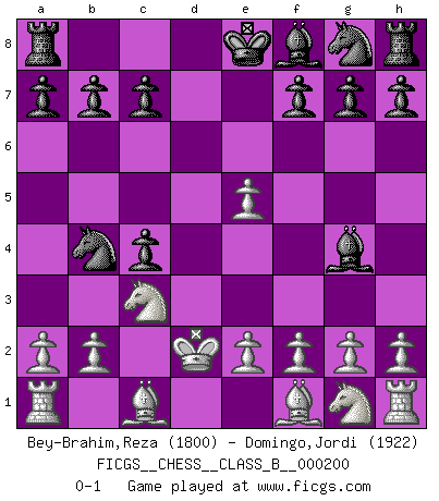 Last move : 0-1 2014 January 10 22:47:7 [Event "FICGS__CHESS__CLASS_B__000200"] [Site "FICGS"] [Date "2013.11.24"] [Round "1"] [White "Bey-Brahim,Reza"] [Black "Domingo,Jordi"] [Result "0-1"] [WhiteElo "1800"] [BlackElo "1922"] 1.d4 d5 2.c4 dxc4 3.Nc3 e5 4.dxe5 Qxd1+ 5.Nxd1 Nc6 6.Nc3 Nb4 7.Kd2 Bg4 0-1 This chess game has been lost on time (started : 2013.11.24 17:13:43) Queen's gambit accepted Player Black won this chess game. Follow this game move after move (download)Chess is a beautiful mistress. (Bent Larsen) Ein unbeabsichtigtes Patt ist der Gipfel der Dummheit. (Anonymous) Un buen jugador siempre tiene buena suerte. (José Raúl Capablanca) Les ravages du H expliquent la différence de niveau entre Tal et Thal [Abergel]. He is a liar. I just don't know what the lie is yet. (Horatio Caine, C.S.I. Miami)