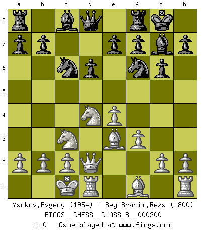 Last move : 1-0 2014 January 16 23:14:15 [Event "FICGS__CHESS__CLASS_B__000200"] [Site "FICGS"] [Date "2013.11.24"] [Round "1"] [White "Yarkov,Evgeny"] [Black "Bey-Brahim,Reza"] [Result "1-0"] [WhiteElo "1954"] [BlackElo "1800"] 1.e4 c5 2.Nf3 d6 3.d4 cxd4 4.Nxd4 Nf6 5.Nc3 g6 6.Be3 Bg7 7.f3 O-O 8.Qd2 Nc6 9.O-O-O 1-0 This chess game has been lost on time (started : 2013.11.24 17:13:43) Sicilian : Dragon, Yugoslav attack, 7...O-O Kingside Castling by player Black (move 7) Queenside Castling by player White (move 9) Player White won this chess game. Follow this game move after move (download)The blunders are all there on the board, waiting to be made. (Savielly Tartakover) Der Knackpunkt bei der Konzentration ist, daß wir nur durch sie etwas Neues und Ungewöhnliches am Schachbrett finden können. Sie ist der einzige Weg durch neue neue Ideen eine Überraschung zu bereiten. (Garry Kasparov) Una compensación adecuada por un sacrificio es tener una combinación sólida que conduce a una posición ganadora; una compensación adecuada por una metida de pata es dejar a tu oponente arrebatar una derrota de las fauces de la victoria. (Bruce A. Moon) La tactique est l'élément le plus important du milieu de jeu. (Siegbert Tarrasch) Life doesn't imitate art, it imitates bad television. (Woody Allen)