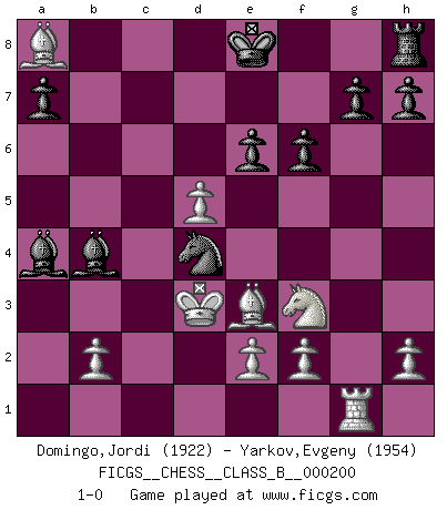 Last move : 1-0 2014 March 24 16:47:17 [Event "FICGS__CHESS__CLASS_B__000200"] [Site "FICGS"] [Date "2013.11.24"] [Round "1"] [White "Domingo,Jordi"] [Black "Yarkov,Evgeny"] [Result "1-0"] [WhiteElo "1922"] [BlackElo "1954"] 1.g4 d5 2.Bg2 Bxg4 3.c4 c6 4.Qb3 Qb6 5.cxd5 Nf6 6.Nc3 Qxb3 7.axb3 cxd5 8.Nxd5 Nxd5 9.Bxd5 Nc6 10.Nf3 f6 11.Rg1 Bd7 12.d4 e6 13.Be4 Nb4 14.Bxb7 Nc2+ 15.Kd1 Nxa1 16.Bxa8 Nxb3 17.Be3 Ba4 18.d5 Nd4 19.Kd2 Bb4+ 20.Kd3 1-0 This chess game has been lost on time (started : 2013.11.24 17:13:43) Grob : Fritz gambit Player White won this chess game. Follow this game move after move (download)Place the contents of the Chess box in a hat, shake them up vigorously, pour them on the board from a height of two feet, and you get the style of Steinitz. (H. E. Bird) Spiel ein langweiliges Spiel zu Ende und lustige Dinge können passieren. (Hans Ree) El Ajedrez es parte de una cultura y si una cultura esta en decadencia, entonces también el Ajedrez declinará. (Mikhail Botvinnik) J'ai toujours senti une vague pitié pour l'homme qui ne connaît rien aux échecs, tout comme j'en aurais pour un homme ignorant de l'amour. Les Echecs, comme la musique ou comme l'amour, ont le pouvoir de rendre heureux. (Siegbert Tarrasch) Cactus - It is depressed cucumber. (Ilmars Cirulis)
