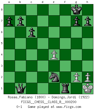 Last move : 0-1 2013 December 8 17:42:32 [Event "FICGS__CHESS__CLASS_B__000200"] [Site "FICGS"] [Date "2013.11.24"] [Round "1"] [White "Rosas,Fabiano"] [Black "Domingo,Jordi"] [Result "0-1"] [WhiteElo "1800"] [BlackElo "1922"] 1.e4 e5 2.Nf3 f5 3.Nxe5 Nf6 4.exf5 Qe7 5.d4 d6 6.Bb5+ c6 7.Ba4 dxe5 8.dxe5 Qxe5+ 9.Be3 Qe4 10.Nc3 Bb4 11.O-O Bxc3 12.bxc3 Qxa4 13.Re1 O-O 14.Bc5 Nbd7 15.Bxf8 Nxf8 16.Qd6 Qxc2 17.Re6 Bxe6 18.fxe6 Ne4 19.Qf4 Nxe6 20.Qe3 Qxc3 21.Qe2 Qxa1+ 22.Qf1 Qxa2 23.f3 Nf4 24.fxe4 Rf8 25.Qf2 Qb1+ 26.Qf1 Ne2+ 27.Kh1 Rxf1+ 0-1 Latvian counter-gambit Kingside Castling by player White (move 11) Kingside Castling by player Black (move 13) Player Black won this chess game. Follow this game move after move (download)I feel as if I were a piece in a game of Chess, when my opponent says of it: That piece cannot be moved. (Soren Kierkegaard) Schach ist das Spiel, das die Verrückten gesund hält. (Albert Einstein) El Ajedrez es un juego de pelea el cual es puramente intelectual e incluye la suerte. (Richard Reti) Pour moi, les échecs ne sont pas un jeu mais un art. (Alexandre Alekhine) The age of a woman doesn't mean a thing. The best tunes are played on the oldest fiddles. (Ralph Waldo Emerson)