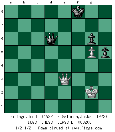 Last move : 1/2-1/2 2014 August 9 10:24:47 [Event "FICGS__CHESS__CLASS_B__000200"] [Site "FICGS"] [Date "2013.11.24"] [Round "1"] [White "Domingo,Jordi"] [Black "Salonen,Jukka"] [Result "1/2-1/2"] [WhiteElo "1922"] [BlackElo "1923"] 1.g4 d5 2.Bg2 e5 3.c4 dxc4 4.Nc3 Qd7 5.h3 Nc6 6.Rb1 Nge7 7.Qa4 h5 8.g5 a6 9.Qxc4 b5 10.Qe4 Qd6 11.d3 Bb7 12.Qf3 Qe6 13.Bd2 Rd8 14.a3 Na5 15.Qg3 Nf5 16.Qh2 Bxg2 17.Qxg2 Nb3 18.Nf3 c5 19.Rd1 g6 20.Ne4 Bg7 21.Bc3 O-O 22.Nfd2 Nbd4 23.Bxd4 cxd4 24.O-O Rc8 25.b4 Rc2 26.Nc5 Qe7 27.Rfe1 Nd6 28.Ndb3 Rc3 29.Rc1 e4 30.dxe4 Nc4 31.f4 Nxa3 32.Rxc3 dxc3 33.e5 c2 34.e3 Rd8 35.Nd4 a5 36.Nxc2 axb4 37.Nb3 Nxc2 38.Qxc2 Qe6 39.Nd4 Qxh3 40.Qg2 Qc8 41.Nc6 Rd7 42.Qe4 Kh7 43.Nd4 Ra7 44.Qc6 Rc7 45.Qxb5 Bf8 46.Qd5 Bc5 47.e6 Bxd4 48.exd4 Rc1 49.Rxc1 Qxc1+ 50.Kg2 Qe3 51.exf7 Qxf4 52.f8Q Qxf8 53.Qb7+ Kg8 54.Qc6 Kg7 55.Qc7+ Qf7 56.Qe5+ Kh7 57.d5 Qb7 58.Kh2 b3 59.d6 b2 60.Qe7+ Qxe7 61.dxe7 b1Q 62.e8Q Qc2+ 63.Kg3 Qd3+ 64.Kh2 Qd6+ 65.Kg2 Kg7 66.Qe3 Kf8 1/2-1/2 Grob's attack Kingside Castling by player Black (move 21) Kingside Castling by player White (move 24) 10 pieces endgame at move 51 : White KQPPP , Black KQPPP WHITE : King + 1 Queen 3 Pawns BLACK : King + 1 Queen 3 Pawns Promotion Queen by player White (move 52) 9 pieces endgame at move 52 : White KQPP , Black KQPPP WHITE : King + 1 Queen 2 Pawns BLACK : King + 1 Queen 3 Pawns 8 pieces endgame at move 60 : White KPP , Black KQPPP WHITE : King + 2 Pawns BLACK : King + 1 Queen 3 Pawns 7 pieces endgame at move 61 : White KPP , Black KPPP WHITE : King + 2 Pawns BLACK : King + 3 Pawns Promotion Queen by player Black (move 61) Promotion Queen by player White (move 62) This chess game ended in a draw. Follow this game move after move (download)You sit at the board and suddenly your heart leaps. Your hand trembles to pick up the piece and move it. But what Chess teaches you is that you must sit there calmly and think about whether it's really a good idea and whether there are other better ideas. (Stanley Kubrick) Moralische Siege zählen nicht. (Savielly Grigorievitsch Tartakower) Cuando me preguntan: -¿Cual es el secreto que te hace hacer mejores movidas que tus oponentes?, Yo respondo: Me da gusto que me pregunten eso, porque, como veran, hay una simple razón. Yo pienso mis propias movidas y dejo a mi oponente que el piense las suyas. (Alexander Alekhine) Les sacrifices démontrent seulement que quelqu'un a gaffé. (Savielly Tartacover) Life is pleasant. Death is peaceful. It's the transition that's troublesome. (Isaac Asimov)