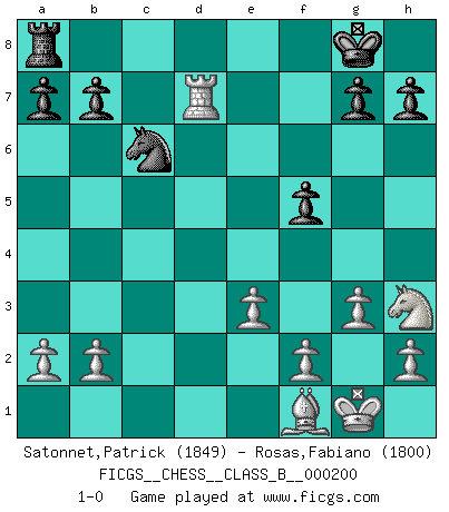 Last move : 1-0 2014 March 21 16:19:23 [Event "FICGS__CHESS__CLASS_B__000200"] [Site "FICGS"] [Date "2013.11.24"] [Round "1"] [White "Satonnet,Patrick"] [Black "Rosas,Fabiano"] [Result "1-0"] [WhiteElo "1849"] [BlackElo "1800"] 1.d4 f5 2.g3 Nf6 3.Bg2 d5 4.Nh3 e6 5.c4 Bb4+ 6.Bd2 Nc6 7.Bxb4 Nxb4 8.Qa4+ Nc6 9.Nc3 O-O 10.O-O Ng4 11.cxd5 exd5 12.Nxd5 Bd7 13.e3 Nce5 14.Qc2 Bb5 15.dxe5 Bxf1 16.Bxf1 Nxe5 17.Nxc7 Qd7 18.Nxa8 Rxa8 19.Rd1 Qc6 20.Qxc6 Nxc6 21.Rd7 1-0 Dutch defense Kingside Castling by player Black (move 9) Kingside Castling by player White (move 10) Player White won this chess game. Follow this game move after move (download)The passed pawn is a criminal, who should be kept under lock and key. Mild measures, such as police surveillance, are not sufficient. (Nimzovitch) Auf jeden Fall musst du zuerst Rechtsanwalt werden, damit du deine eigenen Interessen und die deiner Familie vertreten kannst. [Brief an seinen Sohn] (José Raúl Capablanca) La última cosa en que Fischer estaba interesado era en tonterías, siempre y cuando el Ajedrez estuviera involucrado. (Elie Agur) Karpov est une pièce de musée. (Garry Kasparov) Go and wake up your luck. (Persian saying)