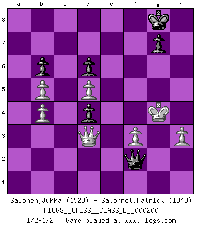 Last move : 1/2-1/2 2014 June 22 9:36:14 [Event "FICGS__CHESS__CLASS_B__000200"] [Site "FICGS"] [Date "2013.11.24"] [Round "1"] [White "Salonen,Jukka"] [Black "Satonnet,Patrick"] [Result "1/2-1/2"] [WhiteElo "1923"] [BlackElo "1849"] 1.e4 e5 2.Nf3 Nc6 3.Bc4 Be7 4.d4 d6 5.d5 Nb8 6.O-O Nf6 7.Nc3 O-O 8.Qe2 Nbd7 9.Be3 h6 10.a4 a5 11.h3 Nh7 12.Bd3 Ng5 13.Nd2 Nh7 14.f3 Bg5 15.Bf2 Bxd2 16.Qxd2 Nhf6 17.Nb5 b6 18.c3 Nh5 19.b4 Nf4 20.Be3 Nxd3 21.Qxd3 Nf6 22.Rfd1 Bd7 23.Rdb1 Nh5 24.Qc4 Bxb5 25.axb5 axb4 26.Rxa8 Qxa8 27.cxb4 f5 28.exf5 Qa3 29.Re1 Ng3 30.Bxh6 Nxf5 31.Bg5 Qb2 32.Rd1 Nd4 33.Rd2 Qb1+ 34.Kh2 Ra8 35.Qxc7 Ra1 36.Kg3 Ra3 37.Qc8+ Kh7 38.Qd7 Rxf3+ 39.gxf3 Qg1+ 40.Rg2 Ne2+ 41.Kh4 Qxg2 42.Qf5+ Kg8 43.Be3 Nd4 44.Bxd4 exd4 45.Qd3 Qf2+ 46.Kg4 Qg2+ 47.Kh4 Qf2+ 48.Kg4 1/2-1/2 Hungarian defense Kingside Castling by player White (move 6) Kingside Castling by player Black (move 7) This chess game ended in a draw. Follow this game move after move (download)I guess a certain amount of temperament is expected of Chess geniuses. (Ron Gross) Wie gewinnt Tal? Er entwickelt alle seine Figuren in die Brettmitte und opfert sie dann irgendwo. (Robert James Fischer) En un gambito tu regalas un Peón por el bién de tomar un juego perdido. (Samuel Standige Boden) Je menace de comprendre la position. (Anonyme) Do you know these so called Volunteers don't even get paid! (Simpsons)