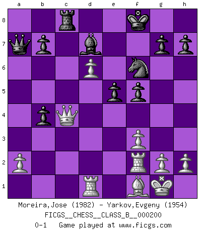 Last move : 0-1 2014 July 25 1:43:59 [Event "FICGS__CHESS__CLASS_B__000200"] [Site "FICGS"] [Date "2013.11.24"] [Round "1"] [White "Moreira,Jose"] [Black "Yarkov,Evgeny"] [Result "0-1"] [WhiteElo "1982"] [BlackElo "1954"] 1.e4 c5 2.Nf3 Nc6 3.d4 cxd4 4.Nxd4 Nf6 5.Nc3 e5 6.Ndb5 d6 7.Nd5 Nxd5 8.exd5 Nb8 9.c4 Be7 10.Be2 a6 11.Nc3 O-O 12.O-O Nd7 13.Be3 f5 14.f3 Bg5 15.Bf2 Qf6 16.Qc2 Qh6 17.Rad1 Be3 18.b4 Bxf2+ 19.Rxf2 Qe3 20.c5 dxc5 21.d6 cxb4 22.Nd5 Qa7 23.Nc7 Rb8 24.Ne6 Nf6 25.Nxf8 Kxf8 26.Qc7 Bd7 27.Bxa6 Qa8 28.Bf1 Qa7 29.Qc4 Rc8 0-1 This chess game has been lost on time (started : 2013.11.24 17:13:43) Sicilian : Pelikan (Lasker/Sveshnikov) variation Kingside Castling by player Black (move 11) Kingside Castling by player White (move 12) Player Black won this chess game. Follow this game move after move (download)Pawns are born free, yet they are everywhere in chains. (Rick Kennedy) Jeder Schachmeister war einmal ein Anfänger. (Irving Chernev) El poder defensivo de una pieza clavada, solamente es imaginario. (Aaron Nimzovich) La menace est plus forte que l'exécution. (Aaron Nimzovitch) A cynic is a man who knows the price of everything but the value of nothing. (Oscar Wilde)