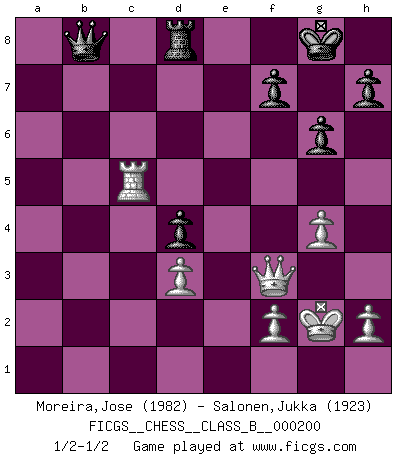 Last move : 1/2-1/2 2014 May 1 23:43:53 [Event "FICGS__CHESS__CLASS_B__000200"] [Site "FICGS"] [Date "2013.11.24"] [Round "1"] [White "Moreira,Jose"] [Black "Salonen,Jukka"] [Result "1/2-1/2"] [WhiteElo "1982"] [BlackElo "1923"] 1.e4 e5 2.Nf3 Nc6 3.Bb5 a6 4.Ba4 Nf6 5.O-O Be7 6.d3 b5 7.Bb3 d6 8.a4 Na5 9.axb5 Nxb3 10.cxb3 O-O 11.Nc3 Bb7 12.bxa6 Rxa6 13.Ra4 Qd7 14.Qc2 c5 15.Bg5 R6a8 16.Nd2 Bc6 17.Ra3 Nh5 18.Bxe7 Qxe7 19.g3 g6 20.Rfa1 Ng7 21.Rxa8 Bxa8 22.Nc4 Bc6 23.Ra6 Ne6 24.Na5 Ba8 25.Qd1 Nd4 26.Nc4 Bc6 27.Ne2 Qc7 28.Nxd4 exd4 29.Qe2 d5 30.exd5 Bxd5 31.Nd6 Bc6 32.b4 Qxd6 33.b5 Qb8 34.Rxc6 Re8 35.Qf3 Qxb5 36.Rc7 Rf8 37.Kg2 Qxb2 38.Rxc5 Rd8 39.g4 Qb8 1/2-1/2 Ruy Lopez : Closed defense Kingside Castling by player White (move 5) Kingside Castling by player Black (move 10) This chess game ended in a draw. Follow this game move after move (download)Of all my Russian books, the defense contains and diffuses the greatest 'warmth' which may seem odd seeing how supremely abstract Chess is supposed to be. (Vladimir Nabokov) Die westlichen Werte sind eine Sprache, welche die Putin-Administration nicht versteht. (Garry Kasparov) Sin errores no puede haber brillantez. (Emanuel Lasker) Les erreurs sont comme les malheurs, elles n'arrivent jamais seules. (Siegbert Tarrasch) Political correctness is subjecting us to gross incompetence. (Johann Piek)