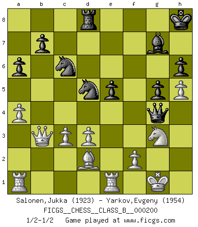 Last move : 1/2-1/2 2014 April 20 13:45:35 [Event "FICGS__CHESS__CLASS_B__000200"] [Site "FICGS"] [Date "2013.11.24"] [Round "1"] [White "Salonen,Jukka"] [Black "Yarkov,Evgeny"] [Result "1/2-1/2"] [WhiteElo "1923"] [BlackElo "1954"] 1.e4 c5 2.Nf3 d6 3.Bc4 Nf6 4.d3 Nc6 5.O-O g6 6.Nc3 Bg7 7.h3 O-O 8.Bg5 a6 9.a4 h6 10.Bf4 e6 11.Re1 e5 12.Be3 Be6 13.Bxe6 fxe6 14.Ne2 Qe7 15.Ng3 Kh7 16.c3 Rad8 17.Qb3 d5 18.exd5 exd5 19.Qb6 Qe6 20.h4 d4 21.Bd2 Nd5 22.Qxc5 Rxf3 23.gxf3 Qf7 24.h5 g5 25.Ne4 Qxf3 26.Qc4 Kh8 27.Qb3 dxc3 28.bxc3 Qg4+ 29.Ng3 1/2-1/2 This chess game has been lost on time (started : 2013.11.24 17:13:43) Sicilian Kingside Castling by player White (move 5) Kingside Castling by player Black (move 7) This chess game ended in a draw. Follow this game move after move (download)Chess is played with the mind and not with the hands ! (Renaud and Kahn) Ich verstehe Aljechins Kombinationen ganz gut; aber woher er diese Angriffschancen bekommt und wie er die Eröffnung behandelt das ist für mich ein Buch mit sieben Siegeln. (Rudolf Spielmann) El Ajedrez es un juego terrible. Si no dominas el centro, tu oponente tiene una posición mas libre. Si tu tienes el centro, entonces realmente tienes algo de que preocuparte. (Siegbert Tarrasch) Il n'y a pas eu de défaite parce que je ne crois pas que cet ordinateur ait jamais existé. IBM a triché en refusant d'imprimer les modes de recherche de la machine. C'est évident, pendant le match, des coups décisifs ont été joués par des êtres humains. Aujourd'hui, les meilleurs spécialistes en informatique ne peuvent toujours pas expliquer comment Deep-Blue a pu jouer contre la logique des ordinateurs. IBM a gagné une guerre de communication, mais ils sont incapables de prouver que l'ordinateur a gagné tout seul. (Garry Kasparov) Wisdom doesn't necessarily come with age. Sometimes age just shows up all by itself. (Tom Watson)