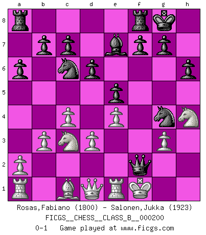 Last move : 0-1 2013 December 3 14:1:32 [Event "FICGS__CHESS__CLASS_B__000200"] [Site "FICGS"] [Date "2013.11.24"] [Round "1"] [White "Rosas,Fabiano"] [Black "Salonen,Jukka"] [Result "0-1"] [WhiteElo "1800"] [BlackElo "1923"] 1.e4 e5 2.Nf3 Nc6 3.g3 d6 4.d3 Be7 5.Nc3 Nf6 6.Bg2 O-O 7.O-O Bg4 8.Nb5 h6 9.h3 Be6 10.b3 Qd7 11.c4 a6 12.Nc3 Bxh3 13.Bxh3 Qxh3 14.Nh4 Ng4 15.Re1 Qh2+ 16.Kf1 Qxf2+ 0-1 Konstantinopolsky Opening Kingside Castling by player Black (move 6) Kingside Castling by player White (move 7) Player Black won this chess game. Follow this game move after move (download)I am still a victim of Chess. It has all the beauty of art and much more. It cannot be commercialized. Chess is much purer than art in its social position. (Marcel Duchamp) Wenn man heute mit 14 Jahren noch kein GM ist, kann man es vergessen. (Viswanathan Anand) No existe un remordimiento como el remordimiento del Ajedrez. (H. G. Wells) Les ravages du H expliquent la différence de niveau entre Tal et Thal [Abergel]. The difference between perseverance and obstinacy is that one comes from a strong will, and the other from a strong won't. (Henry Ward Beecher)