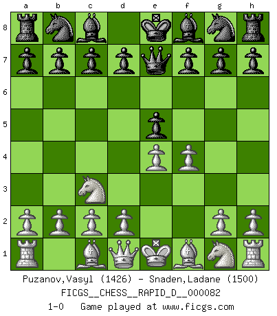 Last move : 1-0 2014 January 25 11:51:9 [Event "FICGS__CHESS__RAPID_D__000082"] [Site "FICGS"] [Date "2013.11.26"] [Round "1"] [White "Puzanov,Vasyl"] [Black "Snaden,Ladane"] [Result "1-0"] [WhiteElo "1426"] [BlackElo "1500"] 1.e4 e5 2.f4 Qe7 3.Nc3 1-0 This chess game has been lost on time (started : 2013.11.26 5:10:38) King's gambit Player White won this chess game. Follow this game move after move (download)I don't believe in psychology. I believe in good moves. (Bobby Fischer) Immer nach dem besten Zug zu suchen ist ziemlich unpraktisch. (Nigel Short) Buenas posiciones no logran ganar juegos, buenas movidas sí. (Gerald Abrahams) Seul un grand joueur sait à quel point il joue faiblement. (Xavier Tartacover) Being number two sucks. (Andre Agassi)