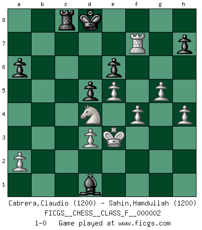 Last move : 1-0 2006 July 3 16:31:36 [Event "FICGS__CHESS__CLASS_F__000002"] [Site "FICGS"] [Date "2006.05.23"] [Round "1"] [White "Cabrera,Claudio"] [Black "Sahin,Hamdullah"] [Result "1-0"] [WhiteElo "1200"] [BlackElo "1200"] 1.e4 e6 2.d4 Nf6 3.Nd2 d5 4.e5 Nfd7 5.f4 c5 6.Ng1f3 Nc6 7.Bd3 Nxd4 8.Nxd4 cxd4 9.Qg4 a6 10.Nf3 Nc5 11.Nxd4 Nxd3+ 12.cxd3 Bb4+ 13.Bd2 Bxd2+ 14.Kxd2 Qe7 15.Qxg7 Rf8 16.Rac1 Qb4+ 17.Ke3 Qxb2 18.Rc7 Bd7 19.Rhc1 Qb4 20.Qf6 Qe7 21.Qxe7+ Kxe7 22.Rxb7 Rfc8 23.Rxc8 Rxc8 24.g4 Kd8 25.h4 Ba4 26.Rxf7 Bd1 27.g5 1-0 French defense Player White won this chess game. Follow this game move after move (download)Chess is the art of analysis. (Mikhail Botvinnik) Ihnen, Herr Lasker, habe ich nur drei Worte zu sagen: Schach und matt. (Siegbert Tarrasch) Un mal día en el Ajedrez, es mejor que cualquier buen día en el trabajo. (Anonymous) Tous ces prétendus hommes politiques sont les pions, les Cavaliers, les Tours ou les Fous d'une partie d'échecs qui se jouera tant qu'un hasard ne renversera pas l'échiquier. (Honoré de Balzac) Luck is the residue of design. (John Milton)