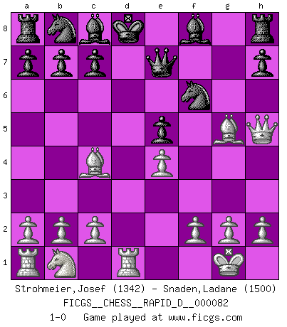 Last move : 1-0 2014 February 7 12:48:25 [Event "FICGS__CHESS__RAPID_D__000082"] [Site "FICGS"] [Date "2013.11.26"] [Round "1"] [White "Strohmeier,Josef"] [Black "Snaden,Ladane"] [Result "1-0"] [WhiteElo "1342"] [BlackElo "1500"] 1.e4 e5 2.Nf3 d6 3.d4 f6 4.Bc4 Qe7 5.O-O g5 6.dxe5 dxe5 7.Nxg5 fxg5 8.Qh5+ Kd8 9.Bxg5 Nf6 10.Rd1+ 1-0 This chess game has been lost on time (started : 2013.11.26 5:10:38) Philidor's defense Kingside Castling by player White (move 5) Player White won this chess game. Follow this game move after move (download)Chess is not like life... it has rules ! (Mark Pasternak) Ich habe die Schachforschung dermaßen betrieben, dass sie auf eine wissenschaftliche Basis gestellt wurde. (Mikhail Moiseyevich Botvinik) El ganador de una partida es aquel jugador que hace el penúltimo error. (Savielly Tartakover) L'ordinateur a tué l'originalité. Il n'y a plus guère d'aventures sur l'échiquier. (Jacob Murray) The general who wins the battle makes many calculations in his temple before the battle is fought. The general who loses makes but few calculations beforehand. (Sun Tzu)