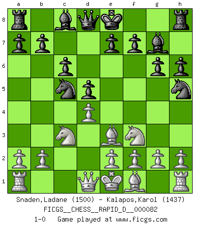 Last move : 1-0 2014 January 29 0:1:57 [Event "FICGS__CHESS__RAPID_D__000082"] [Site "FICGS"] [Date "2013.11.26"] [Round "1"] [White "Snaden,Ladane"] [Black "Kalapos,Karol"] [Result "1-0"] [WhiteElo "1500"] [BlackElo "1437"] 1.d4 Nf6 2.c4 g6 3.Nc3 Bg7 4.Bf4 d5 5.Nb5 Na6 6.c5 c6 7.Nc3 Nh5 8.Bg5 h6 9.Be3 Nxc5 10.Nf3 1-0 This chess game has been lost on time (started : 2013.11.26 5:10:38) King's Indian defense, 3.Nc3 Player White won this chess game. Follow this game move after move (download)The most important feature of the Chess position is the activity of the pieces. This is absolutely fundamental in all phases of the game: Opening, Middlegame and especially Endgame. The primary constraint on a piece's activity is the Pawn structure. (Michael Stean) Wie kann ich Remis annehmen? Ich weiß ja gar nicht, wie ich stehe! (Fritz Sämisch) Haz el enroque temprano y seguido. (Rob Sillars) Ce qui est bien, c'est d'avoir tout un tas de pièces en prise : l'adversaire ne peut en prendre qu'une à la fois. Cité par Thierry Audin. The question of whether computers can think is just like question of whether submarines can swim. (Edsger W. Dijkstra)