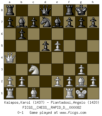 Last move : 0-1 2014 January 17 11:15:58 [Event "FICGS__CHESS__RAPID_D__000082"] [Site "FICGS"] [Date "2013.11.26"] [Round "1"] [White "Kalapos,Karol"] [Black "Piantadosi,Angelo"] [Result "0-1"] [WhiteElo "1437"] [BlackElo "1420"] 1.c4 e6 2.Nf3 d5 3.d4 Nf6 4.g3 Be7 5.Bg2 O-O 6.O-O b6 7.Nc3 Bb7 8.Ne5 Nbd7 9.cxd5 exd5 10.Qa4 Nxe5 11.dxe5 Nd7 0-1 This chess game has been lost on time (started : 2013.11.26 5:10:38) English Opening : Agincourt variation Kingside Castling by player Black (move 5) Kingside Castling by player White (move 6) Player Black won this chess game. Follow this game move after move (download)White lost because he failed to remember the right continuation and had to think up the moves himself. (Siegbert Tarrasch) Frage des Reporters: -Welche besonderen Umstände rechtfertigen das Anhalten der Uhren während einer Turnierpartie? Antwort: -Einen Fotographen zu strangulieren. (Siegbert Tarrasch) Hay jugadores fuertes y personas amables y yo soy un jugador fuerte. (Bobby Fischer) Vous savez, camarade Pachman, je n'éprouve pas de plaisir à être ministre, je jouerais plutôt aux échecs comme vous, ou alors ferais une révolution au Venezuela. (Che Guevara à Ludek Pachman, 'Checkmate in Prague', 1975) I find your interest interesting. (Gregory House, House M.D.)