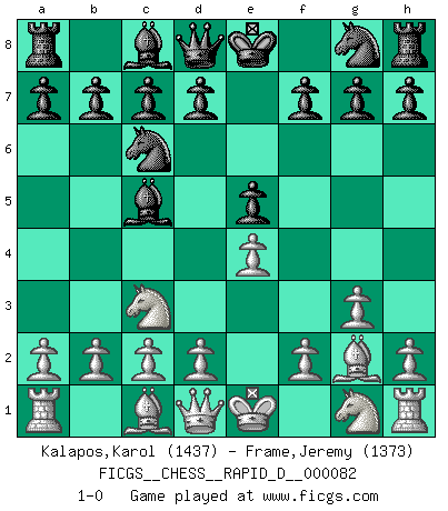 Last move : 1-0 2013 December 3 1:21:7 [Event "FICGS__CHESS__RAPID_D__000082"] [Site "FICGS"] [Date "2013.11.26"] [Round "1"] [White "Kalapos,Karol"] [Black "Frame,Jeremy"] [Result "1-0"] [WhiteElo "1437"] [BlackElo "1373"] 1.Nc3 e5 2.e4 Nc6 3.g3 Bc5 4.Bg2 1-0 Dunst (Sleipner-Heinrichsen) Opening Player White won this chess game. Follow this game move after move (download)When you don't know what to play, wait for an idea to come into your opponent's mind. You may be sure that idea will be wrong. (Siegbert Tarrasch) Zeige mir drei Eröffnungsvarianten und ich beweise dir, dass zwei davon inkorrekt sind. (Emanuel Lasker) Después de una mala apertura, hay una esperanza en el juego medio. Pero una vez que estas en finales, el momento de la verdad ha llegado. (Edmar Mednis) Les réformistes prétendent que les progrès de la théorie conduiront à la disparition des échecs, et qu'il faut, pour leur rendre vie, en remanier les règles. En réalité, qu'exprime cette affirmation? Le mépris de l'intuition, de l'imagination et de tous les autres éléments qui font des échecs un art. (Alexander Alekhine) You must do what you feel is right... of course. (Obi-Wan Kenobi in Star Wars ep.4)