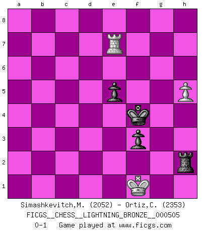Last move : 0-1 2013 November 26 20:59:12 [Event "FICGS__CHESS__LIGHTNING_BRONZE__000505"] [Site "FICGS"] [Date "2013.11.26"] [Round "1"] [White "Simashkevitch,Mykola"] [Black "Ortiz,Clodomiro"] [Result "0-1"] [WhiteElo "2052"] [BlackElo "2353"] 1.e4 e6 2.d4 d5 3.Nc3 Nf6 4.e5 Nfd7 5.f4 c5 6.Nf3 Nc6 7.Be3 a6 8.Qd2 b5 9.a3 Qa5 10.dxc5 Bxc5 11.Bxc5 Nxc5 12.Nd4 Nxd4 13.Qxd4 Na4 14.b4 Qb6 15.Qxb6 Nxb6 16.a4 d4 17.Ne4 bxa4 18.O-O-O Ke7 19.Rxd4 Nd5 20.Bc4 Nxb4 21.Nd6 Nc6 22.Re4 Bd7 23.Rd1 Ra7 24.Be2 Rb8 25.Rxa4 Nxe5 26.Rxa6 Rxa6 27.Bxa6 Ra8 28.fxe5 Rxa6 29.Rd3 f5 30.Rg3 g6 31.Rh3 h5 32.Rg3 Ra5 33.Rxg6 Rxe5 34.Nc4 Re4 35.Rg7+ Kf6 36.Rxd7 Rxc4 37.Rh7 h4 38.Rh6+ Ke5 39.Kd2 Rg4 40.Kd3 Rxg2 41.Rxh4 Rg1 42.Ke3 Rd1 43.c3 Ra1 44.Rh5 Rc1 45.Kd2 Rb1 46.Ke3 Re1+ 47.Kd2 Re4 48.Kd3 Kf4 49.c4 e5 50.c5 Rd4+ 51.Kc3 Rd8 52.c6 Rc8 53.Rh4+ Ke3 54.Rh3+ Ke4 55.Rh6 f4 56.Kd2 Rd8+ 57.Ke1 Rd5 58.Re6 Rc5 59.Ke2 f3+ 60.Kf2 Rc2+ 61.Kf1 Kf5 62.Re7 Rxc6 63.Kf2 Ke4 64.h4 Rc2+ 65.Kg1 Kf4 66.h5 Rg2+ 67.Kf1 Rh2 0-1 French : Steinitz, Boleslavsky variation Queenside Castling by player White (move 18) 10 pieces endgame at move 36 : White KRPPP , Black KRPPP WHITE : King + 1 Rook 3 Pawns BLACK : King + 1 Rook 3 Pawns 9 pieces endgame at move 40 : White KRPP , Black KRPPP WHITE : King + 1 Rook 2 Pawns BLACK : King + 1 Rook 3 Pawns 8 pieces endgame at move 41 : White KRPP , Black KRPP WHITE : King + 1 Rook 2 Pawns BLACK : King + 1 Rook 2 Pawns 7 pieces endgame at move 62 : White KRP , Black KRPP WHITE : King + 1 Rook 1 Pawn BLACK : King + 1 Rook 2 Pawns Player Black won this chess game. Follow this game move after move (download)Chess is really ninety nine percent calculation. (Soltis) Im Schach gibt es keinen Platz für Galanterie. (Irving Chernev) La señal de un Gran Maestro es su habilidad de ganar una partida rápidamente y sin dolor. (Irving Chernev) L'ordinateur a tué l'originalité. Il n'y a plus guère d'aventures sur l'échiquier. (Jacob Murray) The quality of decision is like the well-timed swoop of a falcon which enables it to strike and destroy its victim. (Sun Tzu)