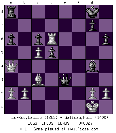 Last move : 0-1 2007 April 4 9:48:20 [Event "FICGS__CHESS__CLASS_F__000027"] [Site "FICGS"] [Date "2007.02.08"] [Round "1"] [White "Kis-Kos,Laszlo"] [Black "Galicza,Pali"] [Result "0-1"] [WhiteElo "1265"] [BlackElo "1400"] 1.e4 c6 2.d4 d5 3.exd5 cxd5 4.c4 Nf6 5.Nc3 e6 6.Nf3 Nc6 7.c5 Ne4 8.Qc2 f5 9.Bb5 a6 10.Bxc6+ bxc6 11.O-O Be7 12.Be3 O-O 13.Ne5 Qc7 14.Nxe4 fxe4 15.f3 exf3 16.Rxf3 Bd7 17.Raf1 Bf6 18.Rh3 h6 19.Ng4 e5 20.Nxf6+ Rxf6 21.Rxf6 Bxh3 22.Rd6 Bg4 23.Qa4 exd4 24.Bxd4 Qe7 25.Bc3 Qe3+ 0-1 Caro-Kann : Panov-Botvinnik attack, 5...e6 Kingside Castling by player White (move 11) Kingside Castling by player Black (move 12) Player Black won this chess game. Follow this game move after move (download)Chess, like love, like music, has the power to make people happy. (Siegbert Tarrasch) Schach ist eine Sache der genauen Beurteilung, wann man zuschlagen und wann man sich ducken muss. (Robert James Fischer) Una partida de Ajedrez se divide en 3 etapas: la primera cuando piensas que tienes la ventaja, la segunda cuando crees que tienes la ventaja y la tercera... ¡cuando te das cuenta que vas a perder!. (Savielly Tartakower) Les échecs, c'est la lutte contre l'erreur. (Johannes Zukertort) The greatest con, that he ever pulled... was making you believe... that he is you. (Revolver, movie)