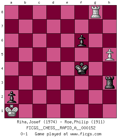 Last move : 0-1 2014 January 11 10:20:49 [Event "FICGS__CHESS__RAPID_A__000152"] [Site "FICGS"] [Date "2013.11.28"] [Round "1"] [White "Riha,Josef"] [Black "Roe,Philip"] [Result "0-1"] [WhiteElo "1974"] [BlackElo "1911"] 1.d4 d5 2.c4 e6 3.Nf3 Nf6 4.Nc3 Be7 5.Bf4 O-O 6.e3 Nbd7 7.Qc2 c5 8.cxd5 cxd4 9.exd4 Nxd5 10.Nxd5 exd5 11.Bd3 Bb4+ 12.Kf1 Nf6 13.h4 Be6 14.g3 Bd6 15.Bxd6 Qxd6 16.Kg2 Ne4 17.Rac1 Qb6 18.Bxe4 dxe4 19.Qxe4 Rfe8 20.Qb1 Bd5 21.Rc5 Be4 22.Qc1 Qe6 23.Qc3 Qxa2 24.Re1 Bxf3+ 25.Kxf3 Rxe1 26.Qxe1 Qxb2 27.Qe4 Qb6 28.Re5 g6 29.Re7 Qf6+ 30.Kg2 Rb8 31.h5 Qf5 32.Qxf5 gxf5 33.d5 a5 34.Kf3 Kf8 35.d6 b5 36.Re5 Rb7 37.Rxf5 a4 38.d7 Rxd7 39.Rxb5 Ra7 40.Rb2 a3 41.Ra2 Ke7 42.Ke4 Ke6 43.Kd3 Kf5 44.Kc2 Kg5 45.Kb1 Kxh5 46.f3 Kg5 47.Ka1 h5 48.Rd2 a2 49.Rd5+ Kg6 50.Rd3 Ra5 51.Rd6+ f6 52.Rd8 Ra3 53.f4 Kf5 54.Rg8 h4 55.gxh4 Kxf4 56.h5 Rh3 0-1 Queen's gambit declined Kingside Castling by player Black (move 5) 10 pieces endgame at move 39 : White KRPPP , Black KRPPP WHITE : King + 1 Rook 3 Pawns BLACK : King + 1 Rook 3 Pawns 9 pieces endgame at move 45 : White KRPP , Black KRPPP WHITE : King + 1 Rook 2 Pawns BLACK : King + 1 Rook 3 Pawns 8 pieces endgame at move 55 : White KRPP , Black KRPP WHITE : King + 1 Rook 2 Pawns BLACK : King + 1 Rook 2 Pawns 7 pieces endgame at move 55 : White KRP , Black KRPP WHITE : King + 1 Rook 1 Pawn BLACK : King + 1 Rook 2 Pawns Player Black won this chess game. Follow this game move after move (download)Fischer, who may or may not be mad as a hatter, has every right to be horrified. (Jeremy Silman) Korrekt heißt in Deutschland die Haltung eines Mannes, dessen Benehmen nach dem Urteile seiner Nachbarn seiner Stellung angemessen ist. Um korrekt zu sein, muß man sich der Meinung der anderen anpassen... (Emanuel Lasker) En el tablero, la mentira e hipocresía no sobreviven mucho. (Emanuel Lasker) A chaque perte on perd un peu de soi. (Joël Lautier) After growing wildly for years, the field of computing appears to be reaching its infancy. (John Pierce)