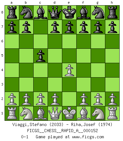 Last move : 0-1 2013 December 30 22:10:50 [Event "FICGS__CHESS__RAPID_A__000152"] [Site "FICGS"] [Date "2013.11.28"] [Round "1"] [White "Viaggi,Stefano"] [Black "Riha,Josef"] [Result "0-1"] [WhiteElo "2033"] [BlackElo "1974"] 1.e4 c5 0-1 This chess game has been lost on time (started : 2013.11.28 23:29:8) Sicilian defense Player Black won this chess game. Follow this game move after move (download)One of these modest little moves may be more embarrassing to your opponent than the biggest threat. (Siegbert Tarrasch) Wie ich sie so einen nach dem anderen nieder mähte wurde meine Überlegenheit offensichtlich. (José Raúl Capablanca) El Ajedrez es una hermosa aventura. (Bent Larsen) En blitz, le Cavalier l'emporte sur le Fou. (Vlastimil Hort) CHESS, n. f. [echecs, Fr.] A nice and abstruse game, in which two sets of puppets are moved in opposition to each other. (Dr Samuel Johnson, A Dictionary Of The English Language, 1755)