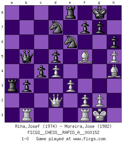Last move : 1-0 2014 February 20 1:30:17 [Event "FICGS__CHESS__RAPID_A__000152"] [Site "FICGS"] [Date "2013.11.28"] [Round "1"] [White "Riha,Josef"] [Black "Moreira,Jose"] [Result "1-0"] [WhiteElo "1974"] [BlackElo "1982"] 1.c4 Nf6 2.d4 e6 3.Nf3 b6 4.a3 Ba6 5.Qc2 d5 6.cxd5 exd5 7.Nc3 Be7 8.Bg5 Bb7 9.e3 Nbd7 10.h4 O-O 11.Bd3 Re8 12.O-O c5 13.Rad1 h6 14.Bf4 c4 15.Bf5 a6 16.Ne5 Nf8 17.Qe2 Bd6 18.h5 Ne6 19.Bg3 Qc8 20.Ng4 Nxg4 21.Bxd6 Qd7 22.Bg3 Nf6 23.Bc2 b5 24.Be5 Qe7 25.Rd2 Bc6 26.Rfd1 Rad8 27.Bf5 a5 28.a4 b4 29.Nb5 Bxb5 30.axb5 a4 31.Rf1 Nd7 32.Bg3 a3 33.bxa3 b3 34.R2d1 Qxa3 35.Qf3 Qa8 36.Bh4 Rb8 37.Rb1 Qb7 38.b6 Ra8 39.Qg4 Qxb6 40.Qf3 Qb5 41.Qd1 Ra3 42.Qd2 1-0 This chess game has been lost on time (started : 2013.11.28 23:29:8) English, 1...Nf6 (Anglo-Indian defense) Kingside Castling by player Black (move 10) Kingside Castling by player White (move 12) Player White won this chess game. Follow this game move after move (download)Even the laziest King flees wildly in the face of a double check ! (Aaron Nimzowitsch) Was ist der Unterschied zwischen einem Strassenarbeiter und einem Schachspieler? --Der Schachspieler bewegt sich ab und zu. (Anonymous) Uno no tiene que jugar muy bien, es suficiente jugar mejor que el oponente. (Siegbert Tarrasch) Soyez une menace à chaque fois que vous vous asseyez pour jouer. (Ken Smith) Life is verb, not a noun. (Charlotte Perkins Gilman)
