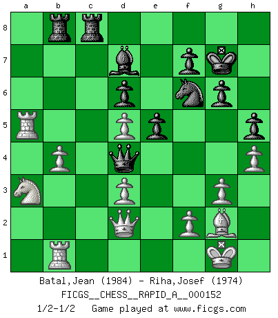 Last move : 1/2-1/2 2014 January 5 19:0:47 [Event "FICGS__CHESS__RAPID_A__000152"] [Site "FICGS"] [Date "2013.11.28"] [Round "1"] [White "Batal,Jean"] [Black "Riha,Josef"] [Result "1/2-1/2"] [WhiteElo "1984"] [BlackElo "1974"] 1.c4 Nf6 2.g3 g6 3.Bg2 Bg7 4.Nc3 O-O 5.d3 d6 6.e3 e5 7.Nge2 Nc6 8.O-O Re8 9.Rb1 a6 10.b4 Bg4 11.h3 Be6 12.Nd5 Rb8 13.Nec3 Ne7 14.Bd2 Nd7 15.e4 b5 16.h4 c6 17.Qe2 h5 18.Ne3 Nf6 19.a4 Qd7 20.Rfc1 Red8 21.Qd1 Rdc8 22.axb5 axb5 23.Ra1 Bh6 24.cxb5 cxb5 25.Ned5 Nexd5 26.exd5 Bg4 27.Qe1 Bxd2 28.Qxd2 Qb7 29.Ra5 Qb6 30.Rb1 Kg7 31.Nxb5 Bd7 32.Na3 Qd4 33.Rb3 Qa1+ 34.Rb1 Qd4 35.Rb3 Qa1+ 36.Rb1 Qd4 1/2-1/2 English, 1...Nf6 (Anglo-Indian defense) Kingside Castling by player Black (move 4) Kingside Castling by player White (move 8) This chess game ended in a draw. Follow this game move after move (download)You are for me the Queen on d8 and I am the Pawn on d7 !! (Eduard Gufeld) Ein Großmeister muß tausende Partien in seinem Kopf speichern, denn diese sind für Ihn, was die Worte der Muttersprache für gewöhnliche Leute sind, oder Noten für Musiker... (Garry Kasparov) Debes de llevar a tu oponente hacia un profundo y obscuro bosque donde 2+2=5, y el camino que conduce a la salida es suficientemente ancho para solamente uno. (Mikhail Tal) Fischer est le meilleur joueur du monde et Karpov n'est qu'un joueur de bistrot. (Garry Kasparov, agé de 16 ans) There will be no order, only chaos. (Sol Robeson in Pi by Darren Aronofsky)