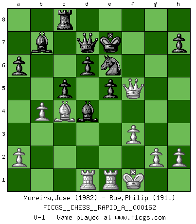 Last move : 0-1 2014 February 23 1:39:1 [Event "FICGS__CHESS__RAPID_A__000152"] [Site "FICGS"] [Date "2013.11.28"] [Round "1"] [White "Moreira,Jose"] [Black "Roe,Philip"] [Result "0-1"] [WhiteElo "1982"] [BlackElo "1911"] 1.e4 c5 2.Nf3 e6 3.d4 cxd4 4.Nxd4 a6 5.Bd3 Bc5 6.Nb3 Be7 7.O-O d6 8.Qg4 g6 9.Qd1 Nd7 10.Nc3 b6 11.Be2 Bb7 12.Qd4 e5 13.Qd3 Rc8 14.Bd2 Ngf6 15.Bh6 Rxc3 16.Qxc3 Nxe4 17.Qe3 f5 18.Rad1 Qc7 19.c4 Kf7 20.Rfe1 Rc8 21.Nd2 Nef6 22.Qh3 Nc5 23.Nf3 Nfe4 24.Nh4 Qd7 25.f3 Ng5 26.Bxg5 Bxg5 27.b4 Ne6 28.Nxf5 gxf5 29.Qxf5+ Ke7 30.c5 Be3+ 31.Kf1 bxc5 32.Bc4 Bd4 0-1 This chess game has been lost on time (started : 2013.11.28 23:29:8) Sicilian : Kan, Polugaievsky variation Kingside Castling by player White (move 7) Player Black won this chess game. Follow this game move after move (download)I look one move ahead... the best ! (Siegbert Tarrasch) Ich möchte Schüler heranbilden, die das Vermögen haben, selbst zu denken und Kritik zu üben. (Emanuel Lasker) Ciertamente, de todas la drogas del mundo, el Ajedrez debe ser el mas placentero permamentemente. (Assiac) Roi des jeux et jeu des rois, les échecs portent en eux un sentiment d'infini. Ils donnent à celui qui s'est efforcé d'en approfondir les arcanes l'impression de n'être pas à la mesure de l'homme; en fait, ils constituent un résumé de l'univers, un microcosme, et figurent cette grande échelle qui, dans les plans de la lumière descend jusqu'à la matière, qui des abîmes insondables remonte jusqu'en l'infini de Dieu. (Pyrame) Perfection is achieved, not when there is nothing more to add, but when there is nothing left to take away. (Antoine de Saint-Exupéry)