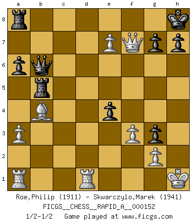 Last move : 1/2-1/2 2014 January 16 15:52:25 [Event "FICGS__CHESS__RAPID_A__000152"] [Site "FICGS"] [Date "2013.11.28"] [Round "1"] [White "Roe,Philip"] [Black "Skwarczylo,Marek"] [Result "1/2-1/2"] [WhiteElo "1911"] [BlackElo "1941"] 1.e4 c5 2.Nf3 Nc6 3.d4 cxd4 4.Nxd4 Nf6 5.Nc3 e5 6.Ndb5 d6 7.Nd5 Nxd5 8.exd5 Ne7 9.c4 Ng6 10.Be2 Be7 11.O-O O-O 12.a3 a6 13.Nc3 f5 14.b4 b6 15.Be3 f4 16.Bd2 Nh4 17.f3 Nf5 18.Bd3 Qe8 19.Ne4 Bd7 20.Qb3 Qg6 21.c5 bxc5 22.bxc5 Rfb8 23.Qa2 Bb5 24.cxd6 Nxd6 25.Bxb5 Rxb5 26.Bb4 Nxe4 27.d6 Kh8 28.dxe7 Qb6+ 29.Kh1 Ng3+ 30.hxg3 fxg3 31.Rfd1 e4 32.Qf7 1/2-1/2 Sicilian : Pelikan (Lasker/Sveshnikov) variation Kingside Castling by player White (move 11) Kingside Castling by player Black (move 11) This chess game ended in a draw. Follow this game move after move (download)Everything is in a state of flux, and this includes the world of Chess. (Mikhail Botvinnik) Ich verstehe mehr vom Schach als irgendein anderer lebender Meister. (José Raúl Capablanca) Una partida de Ajedrez se divide en 3 etapas: la primera cuando piensas que tienes la ventaja, la segunda cuando crees que tienes la ventaja y la tercera... ¡cuando te das cuenta que vas a perder!. (Savielly Tartakower) Tout change constamment, y compris dans le monde des Echecs. (Botvinnik) Life is the sum of all your choices. (Albert Camus)
