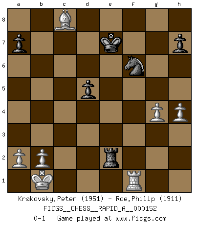 Last move : 0-1 2014 March 21 16:19:23 [Event "FICGS__CHESS__RAPID_A__000152"] [Site "FICGS"] [Date "2013.11.28"] [Round "1"] [White "Krakovsky,Peter"] [Black "Roe,Philip"] [Result "0-1"] [WhiteElo "1951"] [BlackElo "1911"] 1.c4 g6 2.d4 Bg7 3.e4 d6 4.Nc3 Nc6 5.Be3 e5 6.d5 Nd4 7.Nge2 Nxe2 8.Bxe2 f5 9.exf5 gxf5 10.Bh5+ Kf8 11.g3 Nf6 12.Be2 Bd7 13.f3 Kf7 14.Qc2 Re8 15.O-O-O Kg8 16.Bd3 e4 17.fxe4 fxe4 18.Nxe4 Rxe4 19.Bxe4 Qe7 20.Rd4 c5 21.dxc6 Bxc6 22.Bxc6 Qxe3+ 23.Qd2 Bh6 24.Bg2 Qxd4 25.Qxh6 Qxc4+ 26.Kb1 Re8 27.Bxb7 Qd3+ 28.Ka1 Qe3 29.Qxe3 Rxe3 30.Kb1 Kf7 31.Rf1 Re2 32.h4 Ke6 33.g4 d5 34.Bc8+ Ke7 0-1 This chess game has been lost on time (started : 2013.11.28 23:29:8) English Opening Queenside Castling by player White (move 15) Player Black won this chess game. Follow this game move after move (download)Chess is a fairy tale of 1001 blunders. (Savielly Tartakower) Im Schach nämlich geht es darum, daß Ich des Gegners klein zu kriegen, sein Ego zu zerbrechen und zu zermahlen, seine Selbstachtung zu zertreten und zu verscharren und seine ganze mißachtenswerte sogenannte Persönlichkeit ein für alle Mal tot zu hacken und zu zerstampfen und dadurch die menschliche Gesellschaft von einer stinkenden Pestbeule zu befreien. Es ist ein königliches Spiel. (Robert James Fischer) Hoy en día, si tu no eres un Gran Maestro a los 14 años, es mejor que lo olvides. (Anand Viswanathan) On peut tirer plus d'utilité d'une partie perdue que de 100 parties gagnées. (Capablanca) Humor is by far the most significant activity of the human brain. (Edward De Bono)