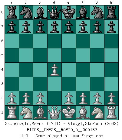 Last move : 1-0 2013 December 30 10:11:5 [Event "FICGS__CHESS__RAPID_A__000152"] [Site "FICGS"] [Date "2013.11.28"] [Round "1"] [White "Skwarczylo,Marek"] [Black "Viaggi,Stefano"] [Result "1-0"] [WhiteElo "1941"] [BlackElo "2033"] 1.d4 1-0 This chess game has been lost on time (started : 2013.11.28 23:29:8) Queen's pawn Player White won this chess game. Follow this game move after move (download)Some part of a mistake is always correct. (Savielly Tartakover) Die Fehler sind da, Sie warten nur darauf gemacht zu werden. (Savielly Grigorievitsch Tartakower) Hay dos clases de hombres: aquellos que se conforman en dejarse llevar por las circunstancias y que juegan barajas y aquellos decididos a controlar las circunstancias y que juegan al Ajedrez. (Mortimer Collins) Il a essayé de se convaincre qu'il pourrait empêcher toutes les erreurs et ne jamais perdre. L'horreur ! Gary Kasparov au sujet de Robert Fischer. All the troubles of the world come from being unable to sit alone in a quiet room. (Blaise Pascal)