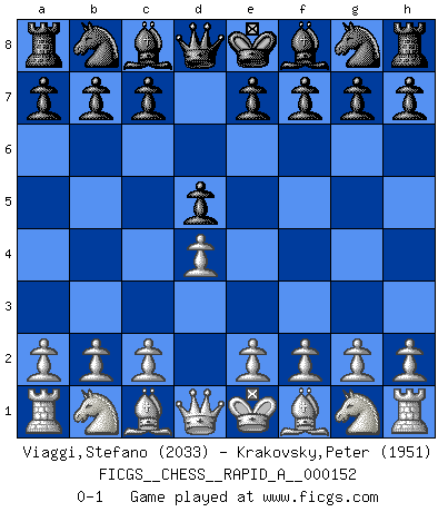 Last move : 0-1 2013 December 30 10:11:5 [Event "FICGS__CHESS__RAPID_A__000152"] [Site "FICGS"] [Date "2013.11.28"] [Round "1"] [White "Viaggi,Stefano"] [Black "Krakovsky,Peter"] [Result "0-1"] [WhiteElo "2033"] [BlackElo "1951"] 1.d4 d5 0-1 This chess game has been lost on time (started : 2013.11.28 23:29:8) Queen's pawn game Player Black won this chess game. Follow this game move after move (download)If your opponent cannot do anything active, then don't rush the position; instead you should let him sit there, suffer, and beg you for a draw. (Jeremy Silman) Aljechin war kein Nazi. Er war ein Opportunist. Ein schrecklicher Mann. Er liebte Geld über alles und würde für Geld ein Jude, ein Katolik oder ein Protestant werden. (Miguel Najdorf) No nos podemos resistir a la fascinación de un sacrificio ya que la pasión por los sacrificios es parte de la naturaleza de un jugador de Ajedrez. (Rudolf Spielman) Toutes les manuvres exécutées sur une colonne ouverte ont pour but ultime l'intrusion définitive sur la septième ou la huitième rangée, en plein cur de la position ennemie. (Aaron Nimzovitch) At work, the authority of a person is inversely proportional to the number of pens that person is carrying. (Dan Rotaru)