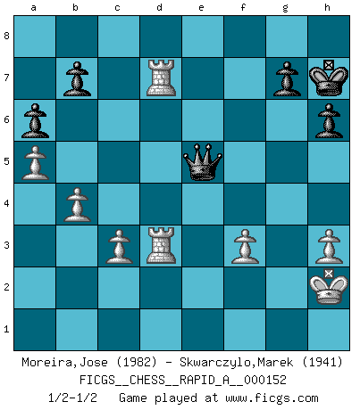 Last move : 1/2-1/2 2014 March 17 22:19:25 [Event "FICGS__CHESS__RAPID_A__000152"] [Site "FICGS"] [Date "2013.11.28"] [Round "1"] [White "Moreira,Jose"] [Black "Skwarczylo,Marek"] [Result "1/2-1/2"] [WhiteElo "1982"] [BlackElo "1941"] 1.e4 c5 2.Nf3 Nc6 3.d4 cxd4 4.Nxd4 Nf6 5.Nc3 e5 6.Ndb5 Bb4 7.a3 Bxc3+ 8.Nxc3 d6 9.Bg5 h6 10.Bxf6 Qxf6 11.Nd5 Qd8 12.Bc4 O-O 13.O-O Be6 14.Qd3 Qg5 15.Ne3 Rad8 16.Rad1 Rd7 17.c3 Rfd8 18.Rd2 Ne7 19.Rfd1 Qf6 20.a4 d5 21.exd5 Nxd5 22.Nxd5 Bxd5 23.Bxd5 Rxd5 24.Qxd5 Rxd5 25.Rxd5 Qf4 26.Rd8+ Kh7 27.a5 Qe4 28.R8d7 f5 29.h3 Qc2 30.R1d2 Qe4 31.Kh2 a6 32.f3 Qe3 33.Rd1 e4 34.fxe4 Qxe4 35.R7d5 f4 36.R1d4 Qe3 37.Rd3 Qe2 38.b4 Qe4 39.Rd7 Kg8 40.Rd8+ Kh7 41.R8d4 Qf5 42.Rd7 f3 43.gxf3 Qe5+ 1/2-1/2 Sicilian : Pelikan (Lasker/Sveshnikov) variation Kingside Castling by player Black (move 12) Kingside Castling by player White (move 13) This chess game ended in a draw. Follow this game move after move (download)Don't even mention losing to me. I can't stand to think of it. (Bobby Fischer) Smyslow ist ein Beweis dafür, dass ich noch zehn Jahre spielen kann! [der 75 jährige über den 85 jährigen] (Viktor Kortschnoi) El Ajedrez es una guerra en un tablero. El objetivo es aplastar la mente del oponente. (Bobby Fischer) Donnez-moi un Cavalier en 6e et je gagnerais toutes mes parties. (Steinitz) There is a very easy way to return from a casino with a small fortune : go there with a large one. (Jack Yelton)