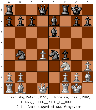 Last move : 0-1 2014 February 23 13:38:32 [Event "FICGS__CHESS__RAPID_A__000152"] [Site "FICGS"] [Date "2013.11.28"] [Round "1"] [White "Krakovsky,Peter"] [Black "Moreira,Jose"] [Result "0-1"] [WhiteElo "1951"] [BlackElo "1982"] 1.c4 Nf6 2.d4 e6 3.Nf3 d5 4.Nc3 Be7 5.Bf4 Nc6 6.e3 Nh5 7.Be5 O-O 8.cxd5 exd5 9.h3 Be6 10.Bh2 f5 11.Bd3 f4 12.e4 Nb4 13.Bb1 dxe4 14.Nxe4 Nf6 15.O-O Nxe4 0-1 This chess game has been lost on time (started : 2013.11.28 23:29:8) English, 1...Nf6 (Anglo-Indian defense) Kingside Castling by player Black (move 7) Kingside Castling by player White (move 15) Player Black won this chess game. Follow this game move after move (download)The way he plays Chess demonstrates a man's whole nature. (Stanley Ellin) In der Schule lernt man nichts. Es ist nur Zeitverschwendung. (Robert James Fischer) El Ajedrez es una hermosa aventura. (Bent Larsen) Même un GMI sait rarement calculer sur plus de cinq coups une attaque à sacrifices. (Rudolf Spielmann) No, no, you're not thinking; you're just being logical. (Niels Bohr)