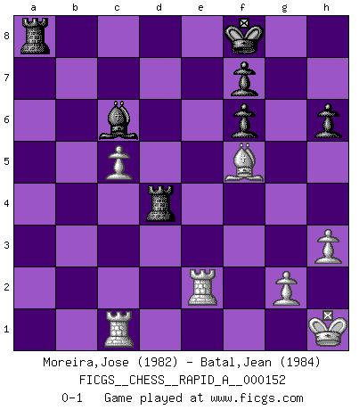 Last move : 0-1 2014 March 1 2:21:48 [Event "FICGS__CHESS__RAPID_A__000152"] [Site "FICGS"] [Date "2013.11.28"] [Round "1"] [White "Moreira,Jose"] [Black "Batal,Jean"] [Result "0-1"] [WhiteElo "1982"] [BlackElo "1984"] 1.e4 e6 2.d4 d5 3.Nc3 dxe4 4.Nxe4 Nd7 5.Nf3 Be7 6.Bd3 Ngf6 7.Nxf6+ Nxf6 8.O-O O-O 9.Qe2 b6 10.Bf4 Bb7 11.Rad1 Qc8 12.c4 Re8 13.Ne5 c5 14.dxc5 Qxc5 15.Rfe1 Rad8 16.Bd2 Qc7 17.Bc3 Bd6 18.b4 Rc8 19.a3 Red8 20.Kh1 h6 21.Kg1 a5 22.h3 axb4 23.axb4 Ra8 24.Bb1 Kf8 25.Qc2 Be7 26.Rc1 Ra7 27.f3 R7a8 28.Kh1 Ba6 29.Qf2 Kg8 30.f4 Bb7 31.f5 exf5 32.Qxf5 Qc8 33.Ng4 Qxf5 34.Bxf5 Kf8 35.Nxf6 Bxf6 36.Bxf6 gxf6 37.Re2 Rd4 38.c5 bxc5 39.bxc5 Bc6 0-1 This chess game has been lost on time (started : 2013.11.28 23:29:8) French : Rubinstein variation Kingside Castling by player White (move 8) Kingside Castling by player Black (move 8) Player Black won this chess game. Follow this game move after move (download)Chess is the gymnasium of the mind. (Blaise Pascal) Herr Iljumschinow ist ein etwas merkwürdiger Geschäftsmann: Er arbeitet zusammen mit Leuten wie Muammar al-Gaddafi; früher ist das Saddam Hussein gewesen. (Joel Lautier) Todo se encuentra en un estado de flujo y esto incluye al mundo del Ajedrez. (Mikhail Botvinnik) Il (Jacob Murray) ne joue pas pour le bon coup, mais pour le meilleur. (Eloi Relange) Life doesn't imitate art, it imitates bad television. (Woody Allen)