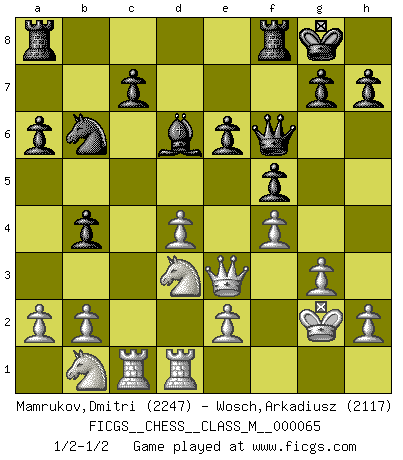 Last move : 1/2-1/2 2014 January 2 18:33:26 [Event "FICGS__CHESS__CLASS_M__000065"] [Site "FICGS"] [Date "2013.11.29"] [Round "1"] [White "Mamrukov,Dmitri"] [Black "Wosch,Arkadiusz"] [Result "1/2-1/2"] [WhiteElo "2247"] [BlackElo "2117"] 1.d4 Nf6 2.c4 e6 3.Nf3 d5 4.g3 Be7 5.Bg2 O-O 6.O-O dxc4 7.Qc2 a6 8.Qxc4 b5 9.Qc2 Bb7 10.Bd2 Be4 11.Qc1 Bb7 12.Bf4 Nd5 13.Nc3 Nxf4 14.Qxf4 Nd7 15.Rfd1 Bd6 16.Qe3 Nb6 17.Ne1 Bxg2 18.Kxg2 Qe7 19.Nd3 f5 20.Rac1 b4 21.Nb1 Qf6 22.f4 1/2-1/2 Queen's pawn game Kingside Castling by player Black (move 5) Kingside Castling by player White (move 6) This chess game ended in a draw. Follow this game move after move (download)It is difficult to play against Einstein's theory --on his first loss to Fischer. (Mikhail Tal) Garry Kasparov war erst in der Großmeister-Organisation GMA, dann in der Profischach-Vereinigung PCA, zum Schluss kehrte er wieder in den Schoß der FIDE zurück. Aber gut, manche Leute sind flexibel (Viswanathan Anand) De todos mis libros Rusos, la defensa contiene y difunde el 'calor' mas grande que pudiese verse extraño al observar lo supremamente abstracto que el Ajedrez supuestamente es. (Vladimir Nabokov) Je ne suis pas le dernier à jouer lâchement des coups douteux pendant le zeïtnot de l'adversaire pour l'achever: en effet les coups qui font le plus peur sont ceux que l'on ne comprend pas. Je me fais souvent peur quand je joue. (Un professeur anonyme) As the days dwindle down... to a precious few. (Maxwell Anderson)