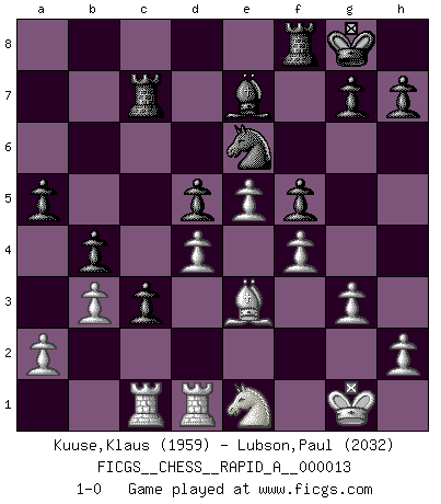 Last move : 1-0 2007 April 14 10:57:17 [Event "FICGS__CHESS__RAPID_A__000013"] [Site "FICGS"] [Date "2007.02.09"] [Round "1"] [White "Kuuse,Klaus"] [Black "Lubson,Paul"] [Result "1-0"] [WhiteElo "1959"] [BlackElo "2032"] 1.e4 e5 2.Nf3 Nc6 3.Bb5 a6 4.Ba4 Nf6 5.O-O Nxe4 6.d4 b5 7.Bb3 d5 8.dxe5 Be6 9.c3 Be7 10.Nbd2 O-O 11.Qe2 Bf5 12.Re1 Nc5 13.Nd4 Nxd4 14.cxd4 Ne6 15.Nf3 c5 16.Rd1 c4 17.Bc2 Bxc2 18.Qxc2 b4 19.Be3 Qd7 20.Rac1 Rac8 21.b3 c3 22.Qd3 Qb5 23.Ne1 Qxd3 24.Nxd3 a5 25.f4 f5 26.g3 Rc7 27.Ne1 1-0 This chess game has been lost on time (started : 2007.02.09 17:4:23) Ruy Lopez : Open, 7.Bb3 Kingside Castling by player White (move 5) Kingside Castling by player Black (move 10) Player White won this chess game. Follow this game move after move (download)Up to this point White has been following well-known analysis. But now he makes a fatal error: he begins to use his own head. (Siegbert Tarrasch) Das Schachspiel hat wie die Liebe, die Musik, die Fähigkeit, den Menschen glücklich zu machen. Ich habe ein leises Gefühl des Bedauerns für jeden, der das Schachspiel nicht kennt, so wie ich jeden bedaure, der die Liebe nicht kennt. (Siegbert Tarrasch) Si un gobernante no entiende al Ajedrez, ¿como puede governar él un reinado?. (El Rey Khusros II) Les Cavaliers se révèlent fort utiles dans les positions fermées. D'habitude, les Fous sont un peu plus forts que les Cavaliers dans les positions ouvertes. Qu'on le veuille ou non, il restera toujours des exceptions ! Luck is when opportunity knocks and you answer. (Anonymous)