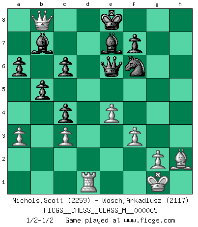 Last move : 1/2-1/2 2014 January 21 12:17:50 [Event "FICGS__CHESS__CLASS_M__000065"] [Site "FICGS"] [Date "2013.11.29"] [Round "1"] [White "Nichols,Scott"] [Black "Wosch,Arkadiusz"] [Result "1/2-1/2"] [WhiteElo "2259"] [BlackElo "2117"] 1.d4 Nf6 2.c4 e6 3.Nf3 d5 4.Nc3 c6 5.Bg5 h6 6.Bh4 dxc4 7.e4 g5 8.Bg3 b5 9.Ne5 Bb7 10.Qf3 h5 11.h3 Nbd7 12.Rd1 Nxe5 13.Bxe5 Rh6 14.Qe3 Nd7 15.Bh2 Qb6 16.Be2 e5 17.O-O Rd8 18.a3 a6 19.Qxg5 exd4 20.Bxh5 Nf6 21.Qe5+ Be7 22.Bf3 dxc3 23.Rxd8+ Qxd8 24.Rd1 Qc8 25.bxc3 Rg6 26.Bg4 Rxg4 27.hxg4 Qxg4 28.f3 Qe6 29.Qb8+ 1/2-1/2 Queen's pawn game Kingside Castling by player White (move 17) This chess game ended in a draw. Follow this game move after move (download)A bad day of Chess is better than any good day at work. (Anonymous) Ihnen, Herr Lasker, habe ich nur drei Worte zu sagen: Schach und matt. (Siegbert Tarrasch) ¿Quién es tu oponente esta tarde? Esta tarde mi oponente son las piezas negras. (Akiba Rubinstein) Tous ces prétendus hommes politiques sont les pions, les Cavaliers, les Tours ou les Fous d'une partie d'échecs qui se jouera tant qu'un hasard ne renversera pas l'échiquier. (Honoré de Balzac) Fortune favours the audacious. (Desiderius Erasmus)
