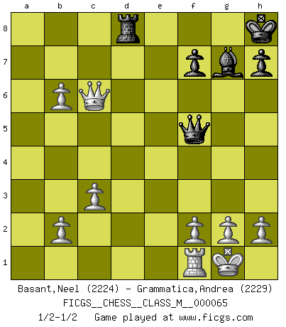 Last move : 1/2-1/2 2014 June 11 20:58:40 [Event "FICGS__CHESS__CLASS_M__000065"] [Site "FICGS"] [Date "2013.11.29"] [Round "1"] [White "Basant,Neel"] [Black "Grammatica,Andrea"] [Result "1/2-1/2"] [WhiteElo "2224"] [BlackElo "2229"] 1.e4 c5 2.Nf3 e6 3.d4 cxd4 4.Nxd4 Nc6 5.Nc3 Nf6 6.Ndb5 d6 7.Bf4 e5 8.Bg5 a6 9.Na3 b5 10.Bxf6 gxf6 11.Nd5 f5 12.Bd3 Be6 13.c3 Bg7 14.Nxb5 axb5 15.Bxb5 Bd7 16.exf5 O-O 17.O-O e4 18.a4 Re8 19.Qg4 Kh8 20.Rad1 Re5 21.Ne3 Qf6 22.Rd5 Rg8 23.Qd1 Rxd5 24.Qxd5 Ne7 25.Qxe4 Bxb5 26.axb5 d5 27.Nxd5 Nxd5 28.Qxd5 Rd8 29.Qc6 Qxf5 30.b6 1/2-1/2 Sicilian : Taimanov variation Kingside Castling by player Black (move 16) Kingside Castling by player White (move 17) This chess game ended in a draw. Follow this game move after move (download)Chess holds its master in its own bonds, shackling the mind and brain so that the inner freedom of the very strongest must suffer. (Albert Einstein) Die unerbitterlichsten Regeln im Schach sind die Ausnahmen. (Savielly Grigorievitsch Tartakower) La maestría del Ajedrez consiste esencialmente en analizar posiciónes de Ajedrez con precisión. (Mikhail Botvinnik) Tout change constamment, y compris dans le monde des Echecs. (Botvinnik) There is no instance of a country having benefited from prolonged warfare. (Sun Tzu)