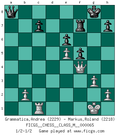 Last move : 1/2-1/2 2014 April 8 18:43:3 [Event "FICGS__CHESS__CLASS_M__000065"] [Site "FICGS"] [Date "2013.11.29"] [Round "1"] [White "Grammatica,Andrea"] [Black "Markus,Roland"] [Result "1/2-1/2"] [WhiteElo "2229"] [BlackElo "2218"] 1.d4 Nf6 2.c4 e6 3.g3 d5 4.Nf3 dxc4 5.Bg2 a6 6.O-O Nc6 7.e3 Rb8 8.Nfd2 Qd7 9.Nxc4 b5 10.Ncd2 Bb7 11.a4 Be7 12.axb5 axb5 13.Nc3 Nd8 14.Bxb7 Nxb7 15.Nf3 O-O 16.Qe2 Nd8 17.Ne5 Qe8 18.Bd2 b4 19.Na4 Ne4 20.Qd3 f5 21.f3 Nxd2 22.Qxd2 Bd6 23.f4 Ra8 24.Qc2 Nb7 25.Rfc1 g5 26.Qb3 gxf4 27.exf4 Bxe5 28.fxe5 Qe7 29.Rc2 Rf7 30.Rac1 Qd7 31.d5 Na5 32.Qxb4 Qxd5 33.Qf4 Nb3 34.Nb6 Qd8 35.Nxa8 Nxc1 36.Rxc1 Qxa8 1/2-1/2 Catalan Opening Kingside Castling by player White (move 6) Kingside Castling by player Black (move 15) This chess game ended in a draw. Follow this game move after move (download)Chess is above all, a fight ! (Emanuel Lasker) Bis zum Jahr 1971 verlief in meiner Schachkariere alles glatt. Dieses dramatische Match [Fischer-Taimanov 6:0] machte mein Leben zur Hölle. (Mark Taimanov) Hasta este punto, las blancas han seguido un análisis bien conocido. Pero ahora el hace un error fatal: empieza a usar su propia cabeza. (Siegbert Tarrasch) Votre seul travail dans les ouvertures est d'obtenir un milieu de partie jouable. (Lajos Portish) Macintosh - we might not get everything right, but at least we knew the century was going to end. (Douglas Adams)