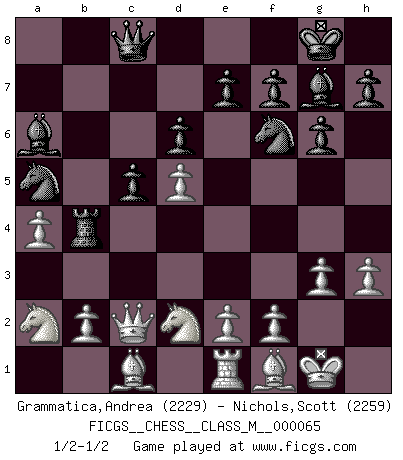 Last move : 1/2-1/2 2013 December 10 10:59:26 [Event "FICGS__CHESS__CLASS_M__000065"] [Site "FICGS"] [Date "2013.11.29"] [Round "1"] [White "Grammatica,Andrea"] [Black "Nichols,Scott"] [Result "1/2-1/2"] [WhiteElo "2229"] [BlackElo "2259"] 1.d4 Nf6 2.c4 g6 3.g3 c5 4.d5 b5 5.cxb5 Bg7 6.Nc3 O-O 7.Bg2 d6 8.Nf3 a6 9.bxa6 Nbd7 10.O-O Nb6 11.Nd2 Bxa6 12.Re1 Qc7 13.a4 Rfb8 14.Qc2 Qb7 15.Ra3 Nc4 16.Rb3 Qc8 17.h3 Na5 18.Rxb8 Rxb8 19.Bf1 Rb4 20.Na2 1/2-1/2 King's Indian : 3.g3 Kingside Castling by player Black (move 6) Kingside Castling by player White (move 10) This chess game ended in a draw. Follow this game move after move (download)Any material change in a position must come about by mate, a capture, or a Pawn promotion. (Purdy) Wenn ich einen Club besuche, sind die Spieler stumm vor Staunen. (José Raúl Capablanca) Cuando tu no sabes absolutamente que mas hacer, es tiempo de entrar en pánico. (John van der Wiel) Des points faibles ou des trous dans la position de l'adversaire doivent être occupés par des pièces et non pas par des pions. (Siegbert Tarrasch) If computers get too powerful, we can organize them into committees. That'll do them in. (Anonymous)