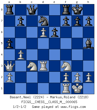 Last move : 1/2-1/2 2014 April 3 21:39:51 [Event "FICGS__CHESS__CLASS_M__000065"] [Site "FICGS"] [Date "2013.11.29"] [Round "1"] [White "Basant,Neel"] [Black "Markus,Roland"] [Result "1/2-1/2"] [WhiteElo "2224"] [BlackElo "2218"] 1.e4 c6 2.Nc3 d5 3.d4 dxe4 4.Nxe4 Bf5 5.Ng3 Bg6 6.Nf3 Nd7 7.Be2 Ngf6 8.O-O e6 9.c4 Bd6 10.Bd2 Qc7 11.Qc1 c5 12.dxc5 Nxc5 13.b4 Nd3 14.Qa3 Nf4 15.c5 Nxe2+ 16.Nxe2 Be7 17.Bf4 Qc8 18.Nc3 O-O 19.Rad1 a5 20.Bd6 Bxd6 21.cxd6 Bh5 22.Rd3 Nd7 1/2-1/2 Caro-Kann defense Kingside Castling by player White (move 8) Kingside Castling by player Black (move 18) This chess game ended in a draw. Follow this game move after move (download)Chess is above all, a fight ! (Emanuel Lasker) Die Elozahlen sind sehr schlecht für das Schach. Jetzt ist Schach eine Sportindustrie, die darauf zielt Elopunkte zu machen. (Miguel Najdorf) Yo tuve un dolor de muelas en la primer partida. En el segundo juego, tuve un dolor de cabeza. En el tercero, tuve un ataque de reumatísmo. En la cuarta partida, no me sentía muy bien. ¿Y en el quinto juego? Bueno, ¿que acaso uno tiene que ganar todos los juegos?. (Siegbert Tarrasch) Les Cavaliers se révèlent fort utiles dans les positions fermées. D'habitude, les Fous sont un peu plus forts que les Cavaliers dans les positions ouvertes. Qu'on le veuille ou non, il restera toujours des exceptions ! A good book on your shelf is a friend that turns its back on you and remains a friend. (Author unknown)