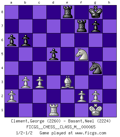 Last move : 1/2-1/2 2014 June 6 22:2:2 [Event "FICGS__CHESS__CLASS_M__000065"] [Site "FICGS"] [Date "2013.11.29"] [Round "1"] [White "Clement,George"] [Black "Basant,Neel"] [Result "1/2-1/2"] [WhiteElo "2260"] [BlackElo "2224"] 1.e4 e6 2.d4 d5 3.Nc3 Nf6 4.Bg5 dxe4 5.Nxe4 Nbd7 6.Nf3 Be7 7.Nxf6+ Nxf6 8.Bd3 b6 9.Ne5 Bb7 10.c3 O-O 11.Qe2 Nd7 12.Bf4 c5 13.Rd1 cxd4 14.Bxh7+ Kxh7 15.Rxd4 Bd5 16.Rxd5 exd5 17.Nc6 Qe8 18.Nxe7 f5 19.O-O Qf7 20.Qe3 Nf6 21.Qh3+ Qh5 22.Qd3 Rae8 23.Nxf5 Qg6 24.Qh3+ Kg8 25.Nd4 Ne4 26.Be3 Nc5 27.Qg3 Qxg3 28.hxg3 Nd3 29.b3 Rf7 30.g4 a6 31.Rd1 Ne5 32.Nf5 Nxg4 1/2-1/2 French : Burn variation Kingside Castling by player Black (move 10) Kingside Castling by player White (move 19) This chess game ended in a draw. Follow this game move after move (download)Pawn endings are to Chess what putting is to golf. (Cecil Purdy) Am wohlsten fühle ich mich, wenn ich sehe, wie sich mein Gegner im Todeskampf windet. (Robert James Fischer) Los problemas de Ajedrez exigen del compositor las mismas virtudes que caracterizan todo el arte de valor: originalidad, invención, concisión, armonía, complejidad e insinceridad explendida. (Vladimir Nabokov) Je ne crois pas en la psychologie, je crois aux bons coups. (Robert Fischer) To be champion requires more than simply being a strong player; one has to be a strong human being as well. (Anatoly Karpov)