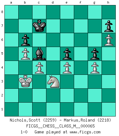 Last move : 1-0 2014 March 27 9:38:58 [Event "FICGS__CHESS__CLASS_M__000065"] [Site "FICGS"] [Date "2013.11.29"] [Round "1"] [White "Nichols,Scott"] [Black "Markus,Roland"] [Result "1-0"] [WhiteElo "2259"] [BlackElo "2218"] 1.d4 Nf6 2.c4 e6 3.Nf3 b6 4.e3 Bb7 5.Bd3 d5 6.O-O dxc4 7.Bxc4 a6 8.Nbd2 c5 9.b3 cxd4 10.Nxd4 Nbd7 11.Be2 Be7 12.Bf3 Nd5 13.Bb2 O-O 14.Qe2 Rc8 15.Rfd1 g6 16.a4 e5 17.Bxd5 Bxd5 18.e4 Ba8 19.N4f3 f6 20.Qxa6 Nc5 21.Qc4+ Kg7 22.Ba3 Rc7 23.Qe2 Qb8 24.h4 Rd8 25.Nc4 Rcd7 26.Rxd7 Rxd7 27.h5 Rd8 28.h6+ Kf8 29.Rc1 Nd3 30.Rd1 Nc5 31.Rxd8+ Qxd8 32.Nfd2 Bb7 33.f3 Ke8 34.Qe3 Qc7 35.Nb1 Kf7 36.Kh2 Ba6 37.Nc3 Bxc4 38.bxc4 Qc6 39.Nd5 Bd6 40.Bxc5 Bxc5 41.Qb3 f5 42.g4 g5 43.Qb5 Qxb5 44.axb5 fxe4 45.fxe4 Bf2 46.Kg2 Bd4 47.Kf3 Kg6 48.Nc7 Kf6 49.Ke2 Ke7 50.Kd2 Kd7 51.Nd5 Ke6 52.Nb4 Bc5 53.Na6 Kd7 54.Kc2 Kc8 55.Kb3 Kb7 56.Nb4 Kc7 57.Nd3 1-0 Queen's Indian : 4.e3 Kingside Castling by player White (move 6) Kingside Castling by player Black (move 13) Player White won this chess game. Follow this game move after move (download)After black's reply to 1.e4 with 1..e5, leaves him always trying to get into the game. (Howard Staunton) Das typische an einem Großmeister ist, daß er eine gewonnene Position schnell und schmerzlos gewinnt. (Irving Chernev) No es una movida, aún la mejor movida que tu debas buscar, sino un plan comprensible. (Eugene Znosko-Borovsky) Nous sommes les pions de la mystérieuse partie d'Echecs jouée par Dieu. Il nous déplace, nous arrête, nous pousse encore, puis nous lance un à un dans la boîte du Néant. Epitaphe sur la tombe de David Janowsky (1868-1927). If only faces could talk... (Pat Summerall, Sportscaster during the Super Bowl)