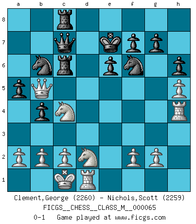 Last move : 0-1 2014 January 25 21:46:22 [Event "FICGS__CHESS__CLASS_M__000065"] [Site "FICGS"] [Date "2013.11.29"] [Round "1"] [White "Clement,George"] [Black "Nichols,Scott"] [Result "0-1"] [WhiteElo "2260"] [BlackElo "2259"] 1.e4 c6 2.d4 d5 3.Nc3 dxe4 4.Nxe4 Bf5 5.Ng3 Bg6 6.h4 h6 7.Nf3 Nd7 8.h5 Bh7 9.Bd3 Bxd3 10.Qxd3 e6 11.Bf4 Qa5+ 12.Bd2 Bb4 13.Ne4 Ngf6 14.Nd6+ Ke7 15.Nc4 Bxd2+ 16.Nfxd2 Qc7 17.O-O-O b5 18.Ne3 Rhd8 19.Qa3+ c5 20.dxc5 a5 21.c6 b4 22.Qa4 Nb6 23.Qb5 Rd6 24.Rh4 Rxc6 25.Nec4 Rc8 0-1 Caro-Kann : Classical, 7...Nd7 Queenside Castling by player White (move 17) Player Black won this chess game. Follow this game move after move (download)When your house is on fire, you can't be bothered with the neighbors. Or, as we say in Chess, if your King is under attack you don't worry about losing a Pawn on the Queen's side. (Gary Kasparov) Sehr viele beherrschen heutzutage das große Einmalseins des Schachspiels und kennen sogar dessen Logarithmentafeln auswendig - deshalb sollte man hin und wieder zu beweisen trachten, dass zwei mal zwei auch fünf sein kann. (Mikhail Nekhemyevich Tal) El Ajedrez es un regaderazo frío para la mente. (Sir John Simon) On a dit que l'homme se distingue de l'animal par le fait qu'il achète plus de livres qu'il ne peut en lire. Je voudrais suggérer qu'inclure à la liste des livres quelques livres d'échecs rendrait la distinction manifeste. (Edward Lasker) I would love to change the world, but they won't give me the source code. (Unknown)