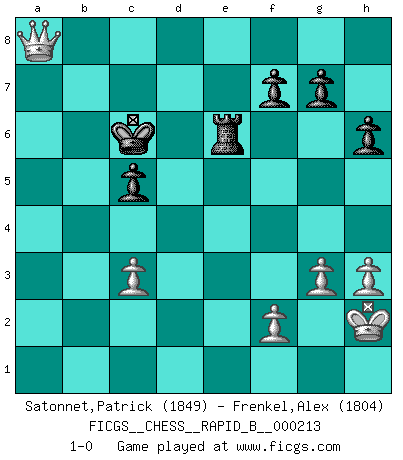 Last move : 1-0 2014 June 6 22:51:14 [Event "FICGS__CHESS__RAPID_B__000213"] [Site "FICGS"] [Date "2013.11.29"] [Round "1"] [White "Satonnet,Patrick"] [Black "Frenkel,Alex"] [Result "1-0"] [WhiteElo "1849"] [BlackElo "1804"] 1.e4 e5 2.Nf3 Nc6 3.Bb5 a6 4.Bxc6 dxc6 5.O-O Qf6 6.d4 exd4 7.Bg5 Qg6 8.Qxd4 Bd6 9.Nbd2 Ne7 10.Rad1 O-O 11.Rfe1 Rd8 12.e5 Nf5 13.Qc3 Be7 14.Ne4 Bxg5 15.Nfxg5 Re8 16.Rd3 h6 17.Nh3 Qg4 18.Qc4 Qh4 19.Nf4 Rb8 20.g3 Qe7 21.Re2 Kh7 22.h3 Qf8 23.Nc5 b5 24.Qc3 b4 25.Qc4 Rb5 26.Nd7 Bxd7 27.Rxd7 Rbxe5 28.Rxe5 Rxe5 29.Qxa6 Qe8 30.Qd3 c5 31.Rxc7 Kh8 32.Qf3 Re1+ 33.Kh2 Nd4 34.Qb7 Rc1 35.Nh5 Kg8 36.c3 bxc3 37.bxc3 Qe1 38.Qc8+ Kh7 39.Nf6+ Kg6 40.Qg4+ Kxf6 41.Qf4+ Nf5 42.Rc6+ Ke7 43.Qc7+ Kf8 44.Qb8+ Qe8 45.Rc8 Re1 46.a4 Re6 47.a5 Nd6 48.Rxe8+ Nxe8 49.Qc8 Ke7 50.a6 Kd6 51.a7 Nc7 52.Qd8+ Kc6 53.a8Q+ Nxa8 54.Qxa8+ 1-0 This chess game has been lost on time (started : 2013.11.29 2:22:24) Ruy Lopez : Exchange variation, 5.O-O Kingside Castling by player White (move 5) Kingside Castling by player Black (move 10) Promotion Queen by player White (move 53) Player White won this chess game. Follow this game move after move (download)A Chess game is a dialogue, a conversation between a player and his opponent. Each move by the opponent may contain threats or be a blunder, but a player cannot defend against threats or take advantage of blunders if he does not first ask himself: What is my opponent planning after each move ? (Bruce A. Moon) Karpov ist ein Museumsstück. (Garry Kasparov) El tablero es el mundo, las piezas es el fenomeno del universo, las reglas del juego son lo que llamamos leyes de la naturaleza y el jugador del lado opuesto, se encuentra oculto a nuestra vista. (Thomas Huxley) Aux échecs, l'amour-propre est satisfait quand on remporte la victoire, mais il n'y a pas de honte à être battu. (Benjamin Franklin) There is far too much law for those who can afford it and far too little for those who cannot. (Derek Bok)