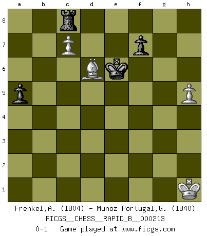 Last move : 0-1 2014 March 30 1:51:26 [Event "FICGS__CHESS__RAPID_B__000213"] [Site "FICGS"] [Date "2013.11.29"] [Round "1"] [White "Frenkel,Alex"] [Black "Munoz Portugal,Guillermo"] [Result "0-1"] [WhiteElo "1804"] [BlackElo "1840"] 1.e4 c5 2.Nf3 d6 3.d4 cxd4 4.Nxd4 Nf6 5.Nc3 a6 6.Be3 e6 7.f3 e5 8.Nb3 Be6 9.Qd2 Nbd7 10.Bd3 h6 11.O-O Qc7 12.f4 Be7 13.f5 Bc4 14.Rae1 d5 15.exd5 Bxd5 16.Nxd5 Nxd5 17.Bf2 O-O 18.Be4 N5f6 19.Bf3 Rfe8 20.Bg3 a5 21.Kh1 a4 22.Nc1 Qb6 23.Nd3 Bd6 24.Nf2 e4 25.Qxd6 exf3 26.Qxb6 Nxb6 27.gxf3 Nc4 28.Bh4 Nd2 29.Bxf6 Nxf1 30.Ne4 Nd2 31.Rg1 Nxe4 32.Rxg7+ Kf8 33.fxe4 Rxe4 34.Rh7 Rg4 35.Rxh6 Re8 36.h3 Rg8 37.c4 Re1 38.Kh2 Re2 39.Kh1 a3 40.bxa3 Rxa2 41.h4 Rxa3 42.Bg5 Ra6 43.Rxa6 bxa6 44.c5 a5 45.c6 Kg7 46.c7 Rc8 47.Bf4 Kf6 48.Bd6 Kxf5 49.h5 Ke6 0-1 Sicilian : Najdorf, Byrne (English) attack Kingside Castling by player White (move 11) Kingside Castling by player Black (move 17) 10 pieces endgame at move 43 : White KRBPPP , Black KRPP WHITE : King + 1 Rook 1 Bishop 3 Pawns BLACK : King + 1 Rook 2 Pawns 9 pieces endgame at move 43 : White KBPPP , Black KRPP WHITE : King + 1 Bishop 3 Pawns BLACK : King + 1 Rook 2 Pawns 8 pieces endgame at move 48 : White KBPP , Black KRPP WHITE : King + 1 Bishop 2 Pawns BLACK : King + 1 Rook 2 Pawns Player Black won this chess game. Follow this game move after move (download)Chess is a terrific way for kids to build self image and self esteem. (Saudin Robovic) Du kannst im Schach nur gut werden, wenn du das Spiel liebst. (Robert James Fischer) No hay otro maestro que tenga una voluntad terrífica de ganar. Al tablero, el irradía peligro y aún los oponentes mas fuertes tienden a congelarse como liebres cuando olfatean a una pantera. Aún sus debilidades son peligrosas. Con las blancas, su juego de apertura es predecible - te es posible hacer planes en su contra - pero es tan fuerte que tus planes casi nunca funcionan. En el juego medio, su precisión e invención son fabulosas y en finales, tú simplemente no le puedes vencer. (Experto Alemán anónimo) Il n'y a pas eu de défaite parce que je ne crois pas que cet ordinateur ait jamais existé. IBM a triché en refusant d'imprimer les modes de recherche de la machine. C'est évident, pendant le match, des coups décisifs ont été joués par des êtres humains. Aujourd'hui, les meilleurs spécialistes en informatique ne peuvent toujours pas expliquer comment Deep-Blue a pu jouer contre la logique des ordinateurs. IBM a gagné une guerre de communication, mais ils sont incapables de prouver que l'ordinateur a gagné tout seul. (Garry Kasparov) Bobby never cared about money, though. His only desire was to prove that his choices were correct: He wanted chess to be important because he was a chess player, and he wanted to be important. Bobby knew money was important, but he didn't have a clue why, outside of clothes and status. The only way he could accomplish what he wanted was to fight for a lot of money. Once he got it, he gave it away. He did not know how to spend it. And once he'd become champion, after, essentially, sacrificing his life for it, he didn't know how to spend his time. (Bob Wade)