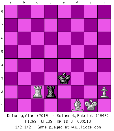 Last move : 1/2-1/2 2014 July 3 15:37:10 [Event "FICGS__CHESS__RAPID_B__000213"] [Site "FICGS"] [Date "2013.11.29"] [Round "1"] [White "Delaney,Alan"] [Black "Satonnet,Patrick"] [Result "1/2-1/2"] [WhiteElo "2019"] [BlackElo "1849"] 1.d4 Nf6 2.c4 g6 3.Nc3 Bg7 4.e4 d6 5.Nf3 O-O 6.Be2 e5 7.O-O Nc6 8.d5 Ne7 9.b4 Ne8 10.c5 f5 11.Ng5 Nf6 12.f3 h6 13.Ne6 Bxe6 14.dxe6 d5 15.exd5 Nfxd5 16.Nxd5 Qxd5 17.Qb3 Qxb3 18.axb3 a6 19.Bb2 Rad8 20.Rae1 Rfe8 21.b5 axb5 22.Bxb5 c6 23.Bc4 Nd5 24.Bxe5 Rxe6 25.Bd6 Bd4+ 26.Kh1 Rxe1 27.Rxe1 Bf6 28.g4 Kf7 29.gxf5 gxf5 30.b4 Re8 31.Rd1 Re3 32.b5 Rxf3 33.b6 Rc3 34.Ba6 Be7 35.Bxb7 Bxd6 36.cxd6 Ke6 37.Rb1 Kxd6 38.Ba6 Nxb6 39.Rxb6 Rc1+ 40.Kg2 Rc2+ 41.Kg1 Ke5 42.Bd3 Rd2 43.Bf1 Rc2 44.Bd3 Rd2 45.Bf1 Rc2 46.Rb3 c5 47.Rh3 c4 48.Rxh6 Ke4 49.Rc6 Kf3 50.Rc5 c3 51.Rxf5+ Ke3 52.Rd5 Rd2 53.Rc5 c2 54.Rxc2 1/2-1/2 King's Indian : Orthodox, Aronin-Taimanov variation (Yugoslav attack / Mar del Plata variation) Kingside Castling by player Black (move 5) Kingside Castling by player White (move 7) 10 pieces endgame at move 38 : White KRBP , Black KRNPPP WHITE : King + 1 Rook 1 Bishop 1 Pawn BLACK : King + 1 Rook 1 Knight 3 Pawns 9 pieces endgame at move 39 : White KRBP , Black KRPPP WHITE : King + 1 Rook 1 Bishop 1 Pawn BLACK : King + 1 Rook 3 Pawns 8 pieces endgame at move 48 : White KRBP , Black KRPP WHITE : King + 1 Rook 1 Bishop 1 Pawn BLACK : King + 1 Rook 2 Pawns 7 pieces endgame at move 51 : White KRBP , Black KRP WHITE : King + 1 Rook 1 Bishop 1 Pawn BLACK : King + 1 Rook 1 Pawn 6 pieces endgame at move 54 : White KRBP , Black KR WHITE : King + 1 Rook 1 Bishop 1 Pawn BLACK : King + 1 Rook This chess game ended in a draw. Follow this game move after move (download)Strategy requires thought, tactics require observation. (Max Euwe) Über die Verhaftung Bobby Fischers: Warum es die Bush-Administration für nötig befindet einen 61 Jahre alten Mann zu hetzten, der für niemanden ausser sich selbste eine Gefahr darstellt ist ein Rätsel. (Nigel Short) No hay precio que no valga la pena por la cabellera del Rey enemigo. (Koblentz) Les pièces de l'échiquier étaient impitoyables. Elles le retenaient, elles l'absorbaient. Il y avait de l'horreur en cela, mais aussi une harmonie unique. Car, qu'y a-t-il dans le monde, à part les échecs ? (V. Nabokov) Over-the-board chess is the favorite of mortals, correspondence chess is the favorite of the gods. (Eduard Dyckhoff)