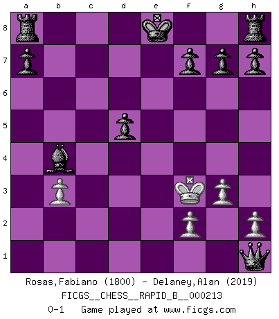 Last move : 0-1 2014 March 3 14:36:8 [Event "FICGS__CHESS__RAPID_B__000213"] [Site "FICGS"] [Date "2013.11.29"] [Round "1"] [White "Rosas,Fabiano"] [Black "Delaney,Alan"] [Result "0-1"] [WhiteElo "1800"] [BlackElo "2019"] 1.e4 d6 2.d4 Nf6 3.Nc3 e5 4.Nd5 Nxe4 5.Nf3 c6 6.Bd3 cxd5 7.Bb5+ Bd7 8.a4 Qa5+ 9.Bd2 Nxd2 10.Nxd2 Bxb5 11.axb5 Qxb5 12.b3 exd4 13.Ra4 Nc6 14.c4 dxc3 15.Nb1 d4 16.Na3 Qe5+ 17.Kf1 b5 18.Ra6 Nb4 19.Ra5 d3 20.Rxb5 d5 21.g3 c2 22.Nxc2 dxc2 23.Qc1 Qe4 24.Qe3 c1Q+ 25.Qxc1 Qxh1+ 26.Ke2 Qxc1 27.Rxb4 Bxb4 28.Kf3 Qh1+ 0-1 This chess game has been lost on time (started : 2013.11.29 2:22:24) Pirc defense Promotion Queen by player Black (move 24) Player Black won this chess game. Follow this game move after move (download)For me, Chess is life and every game is like a new life. Every Chess player gets to live many lives in one lifetime. (Eduard Gufeld) Pläne sind die Träume des Verständigen. (Ernst Freiherr von Feuchtersleben) En la perfecta combinación de Ajedrez como en una historia corta de primera clase, toda la trama y contra trama deberá conducir hacia un final sorprendente, el interes no es mitigado hasta el último momento. (Yates and Winter) D'abord les bases : Jouez et étudiez, puis étudiez et jouez, ensuite jouez et étudiez, puis étudiez et jouez. Deuxièmement : Donnez toujours le meilleur de vous-même ! (Ken Smith) Computers are like Old Testament gods; lots of rules and no mercy. (Joseph Campbell)