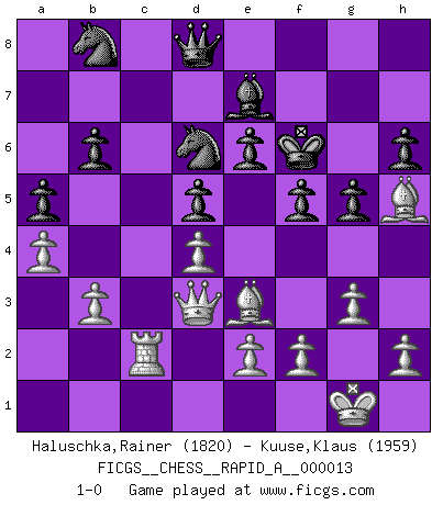 Last move : 1-0 2007 May 31 11:43:12 [Event "FICGS__CHESS__RAPID_A__000013"] [Site "FICGS"] [Date "2007.02.09"] [Round "1"] [White "Haluschka,Rainer"] [Black "Kuuse,Klaus"] [Result "1-0"] [WhiteElo "1820"] [BlackElo "1959"] 1.d4 f5 2.c4 Nf6 3.Nf3 e6 4.g3 Be7 5.Bg2 O-O 6.O-O c6 7.b3 d5 8.Bb2 Bd7 9.Nbd2 Be8 10.Ng5 Bf7 11.Ndf3 h6 12.Nxf7 Rxf7 13.Ne5 Rf8 14.Rc1 Nbd7 15.Ng6 Rf7 16.Qd3 Nf8 17.Ne5 Rc8 18.Nxf7 Kxf7 19.a4 a5 20.cxd5 cxd5 21.Rxc8 Qxc8 22.Rc1 Qd8 23.Qb5 b6 24.Rc6 N8d7 25.Bc1 g5 26.Be3 Ne4 27.Bf3 Nd6 28.Qd3 Nb8 29.Bh5+ Kf6 30.Rc2 1-0 This chess game has been lost on time (started : 2007.02.09 17:4:23) Dutch defense Kingside Castling by player Black (move 5) Kingside Castling by player White (move 6) Player White won this chess game. Follow this game move after move (download)Chess is 99 percent tactics. (Teichmann) Mein erstes Ziel war nicht, die Partie zu gewinnen, sondern eine Figur zu opfern. -- der junge (Wilhelm Steinitz) El juego del Ajedrez no es solamente una diversión quieta; algunas cualidades muy valuables de la mente se pueden adquirir y cultivar con el, como convertirlos en habitos disponibles para toda ocasión; ya que la vida es algo así como el Ajedrez. (Benjamin Franklin) Je fais ceci parce que dans cinquante coups j'obtiendrai cela; je m'appelle Mikhail Moisevitch Botvinnik. (Botvinnik) All men can see these tactics whereby I conquer, but what none can see is the strategy out of which victory is evolved. (Sun Tzu)