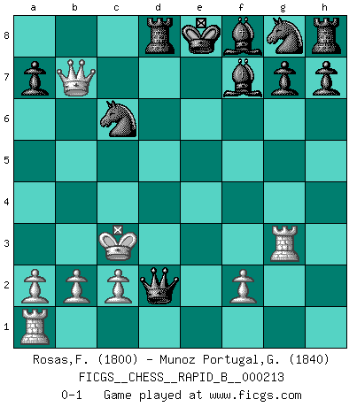 Last move : 0-1 2014 January 5 22:15:47 [Event "FICGS__CHESS__RAPID_B__000213"] [Site "FICGS"] [Date "2013.11.29"] [Round "1"] [White "Rosas,Fabiano"] [Black "Munoz Portugal,Guillermo"] [Result "0-1"] [WhiteElo "1800"] [BlackElo "1840"] 1.e4 e6 2.e5 d6 3.d4 dxe5 4.Nf3 exd4 5.Nxd4 e5 6.Bb5+ c6 7.Bg5 Qxg5 8.Nf3 Qxg2 9.Rg1 Qh3 10.Nxe5 cxb5 11.Rg3 Qxh2 12.Qe2 Qh1 13.Kd2 Be6 14.Qxb5+ Nc6 15.Nxf7 Bxf7 16.Qxb7 Rd8 17.Kc3 Qe1 18.Nd2 Qxd2 0-1 French : Steinitz attack Player Black won this chess game. Follow this game move after move (download)You have to have the fighting spirit. You have to force moves and take chances. (Bobby Fischer) Intelligenz läßt sich nicht am Weg, sondern nur am Ergebnis feststellen. (Garry Kasparov) Una victoria por una combinación errónea, aunque sea espectacular, me llena de horror artístico. (Wilhelm Steinitz) Même si l'adversaire joue le coup analysé précédemment, recommencez l'analyse en voyant la nouvelle position. Première règle de Blumenfeld Even the best needles are not sharp at both ends. (Chinese proverb)